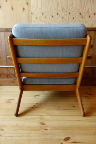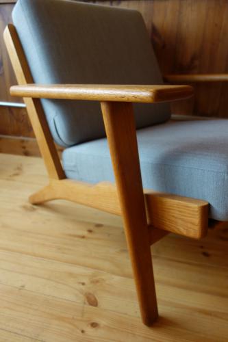 "Meister" Hans Wegner/ハンス・ウェグナーが1953年にデザインし、GETAMA社より販売されたソファです。60年を経てなお、人気があり、現在でも製造・販売されています。あまりにも有名になったため「ジェネリック」という名のコピー製品も多く作られていますが、絶対に真似ができないのが、後ろ脚の角度と構造です。座面の支えがそのまま延長して後ろ脚になり、その滑らかな曲線上に背もたれが絶妙な角度で取り付けてあります。この背と後ろ脚、内部でホゾが複雑に組まれているため、緩んでも外れることはありません。