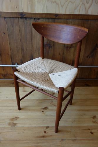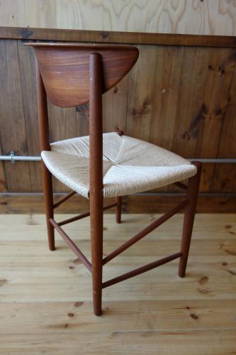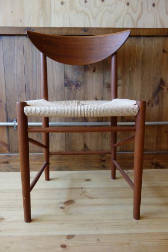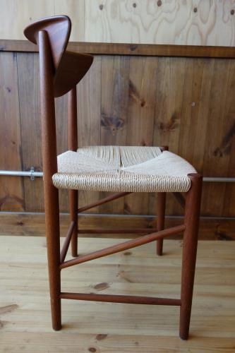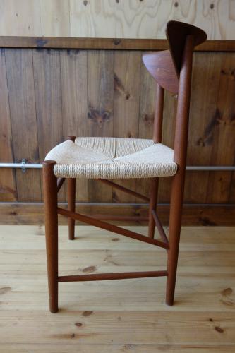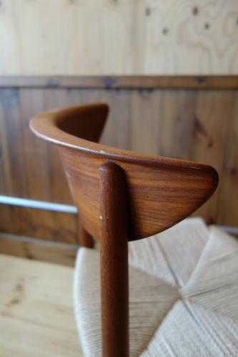 P.Hvidt & O.M.Nielsenと言えば、「箱物」ですが、もちろん、沢山の椅子も作ってます。中でも様々なスタイルでデザインされた「AX Chair」シリーズが一番有名かと思います。そして、ダイニングチェアでは、この椅子。背もたれが、いかにも彼ららしいデザインの椅子ですが、この椅子の一番の特徴は、Fin JuhlやMogensenを思わせるような、貫きの組み方とペーパーコード。修理職人泣かせではあるのですが、シンプルでいて、非常に細かい組み方。見る角度で、美しさも変わります。ペーパーコードは、一度、張替済みです。