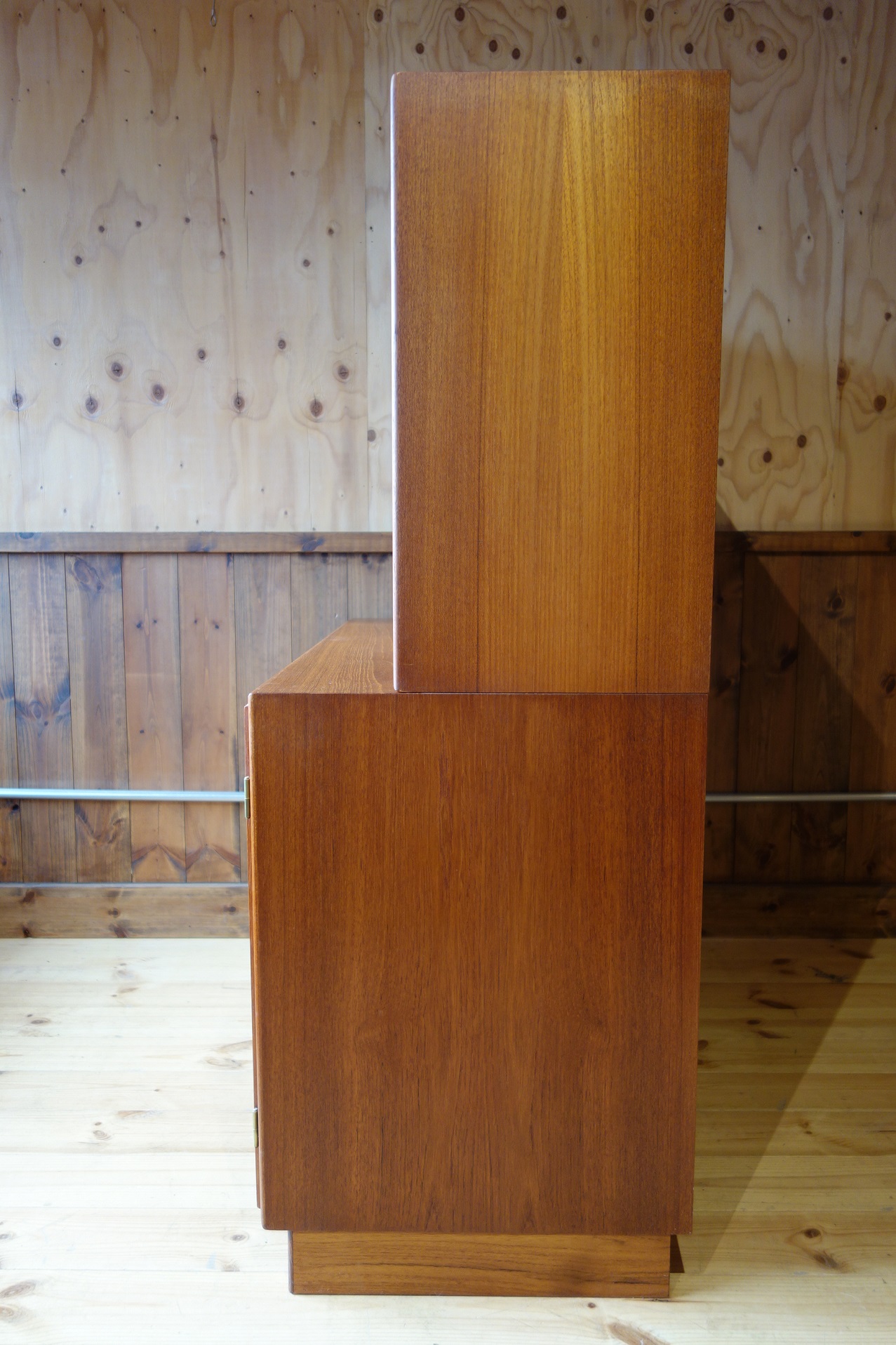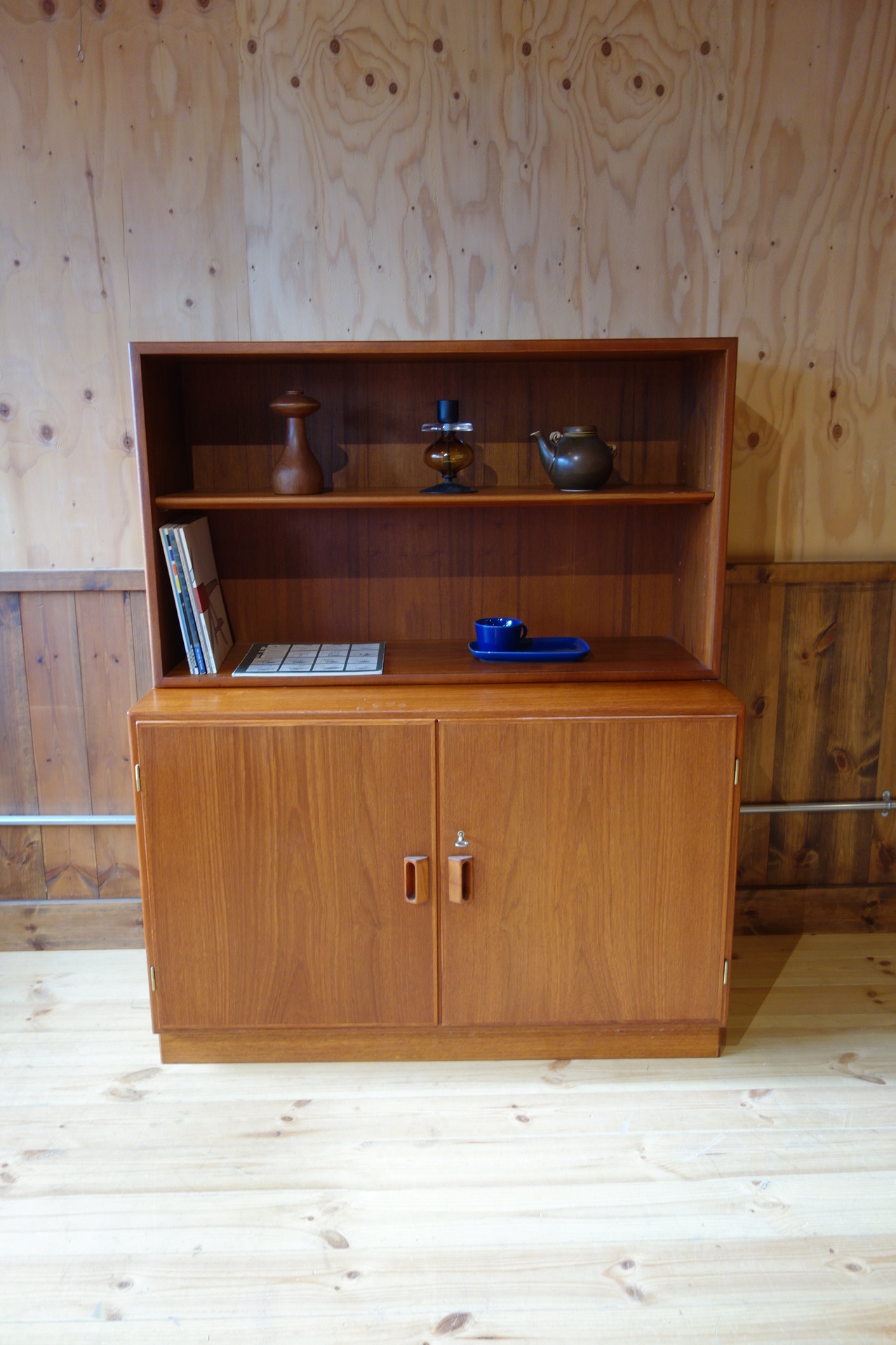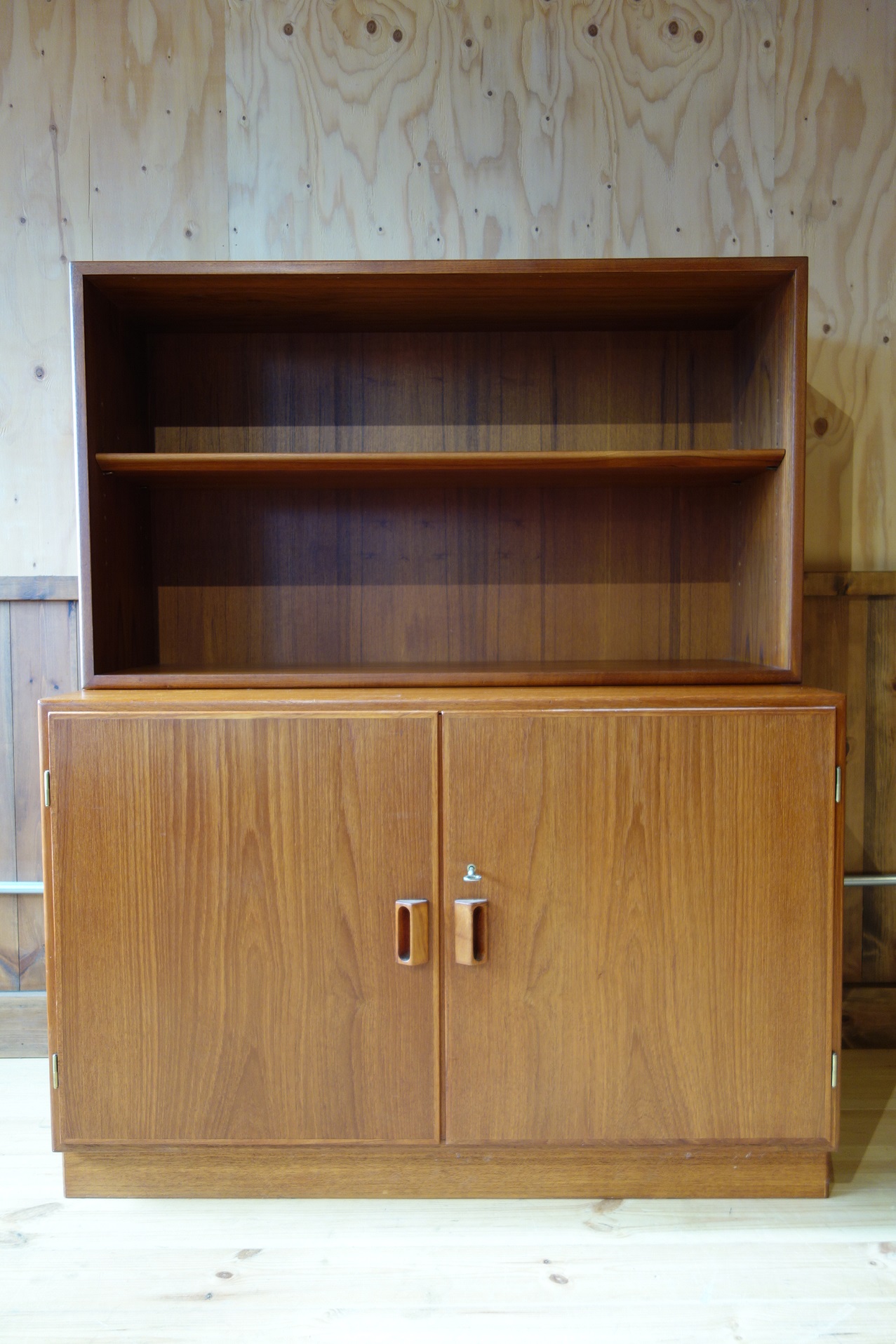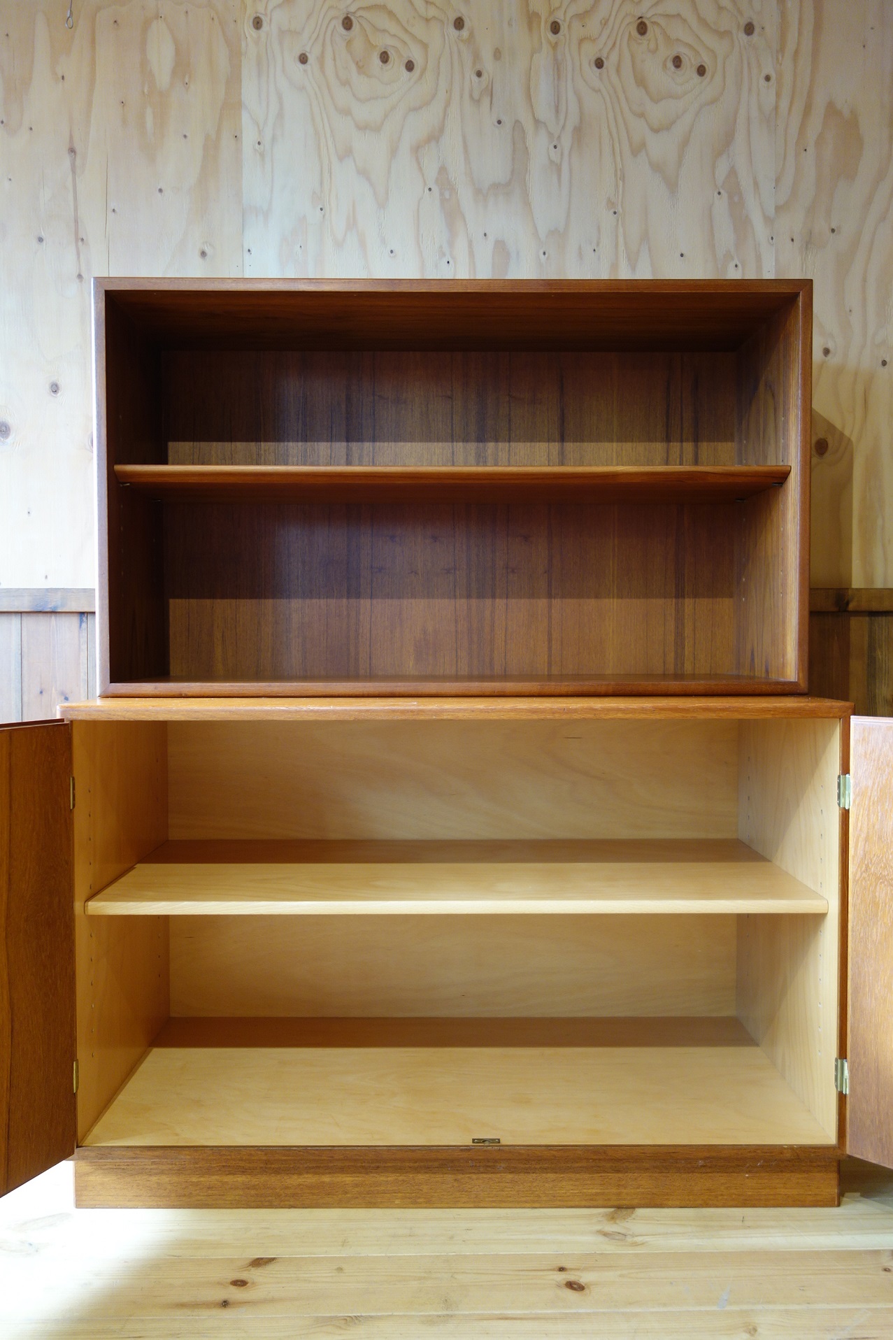 今回の物は下部は観音開きの扉に、一枚の可動式棚板が付くタイプで、上部は背の低い、棚板一枚のシェルフになっています。上下バラバラに使用することも、カスタマイズ(上部に脚や扉の取り付けなど)も可能です。