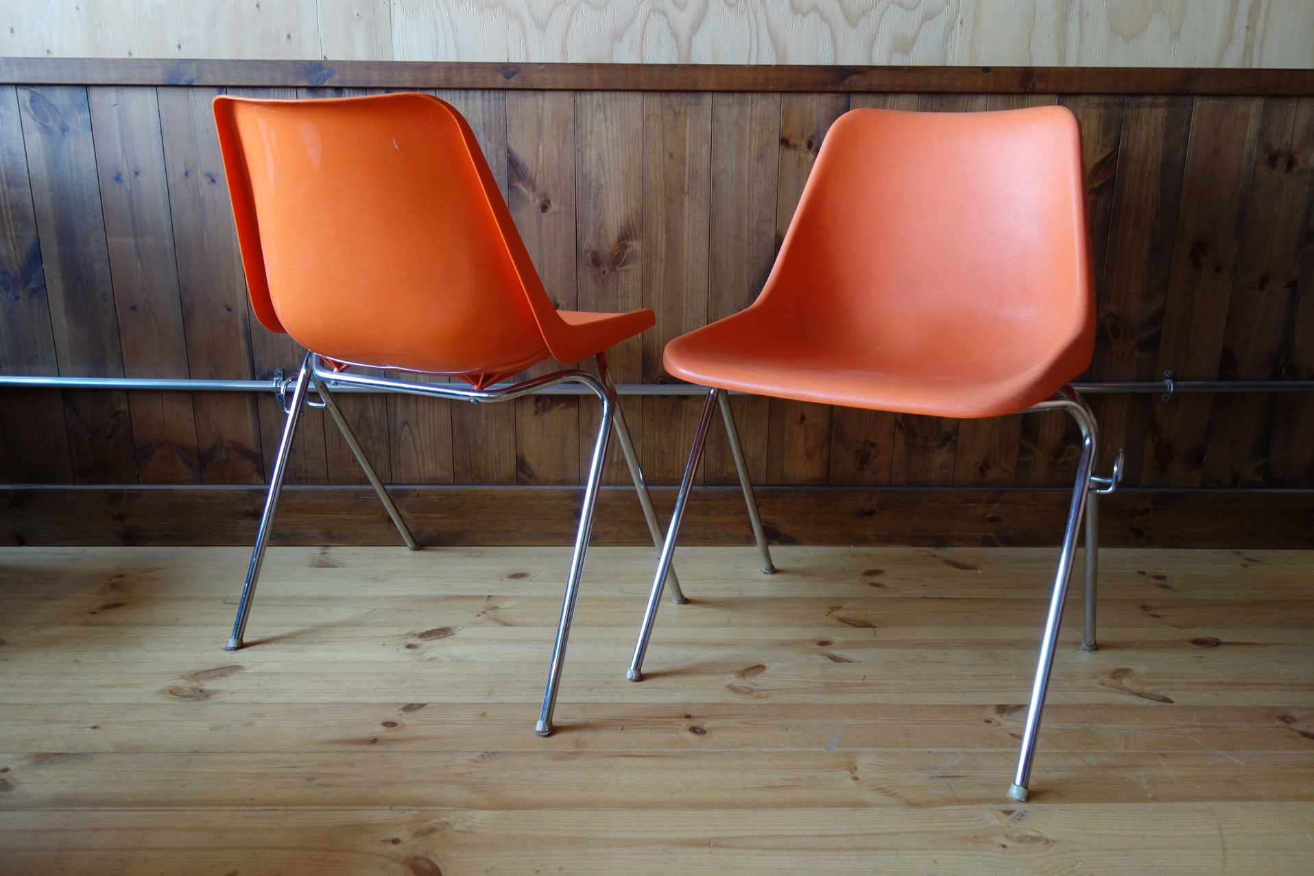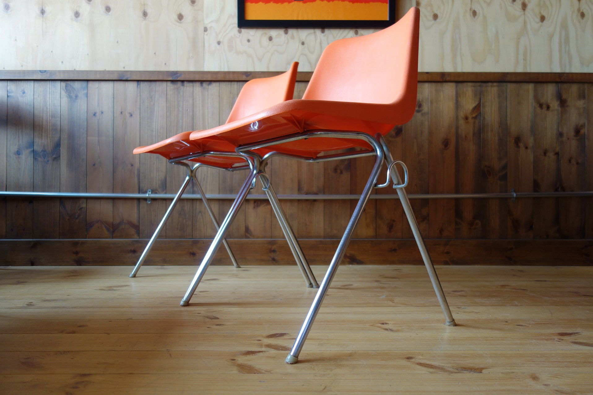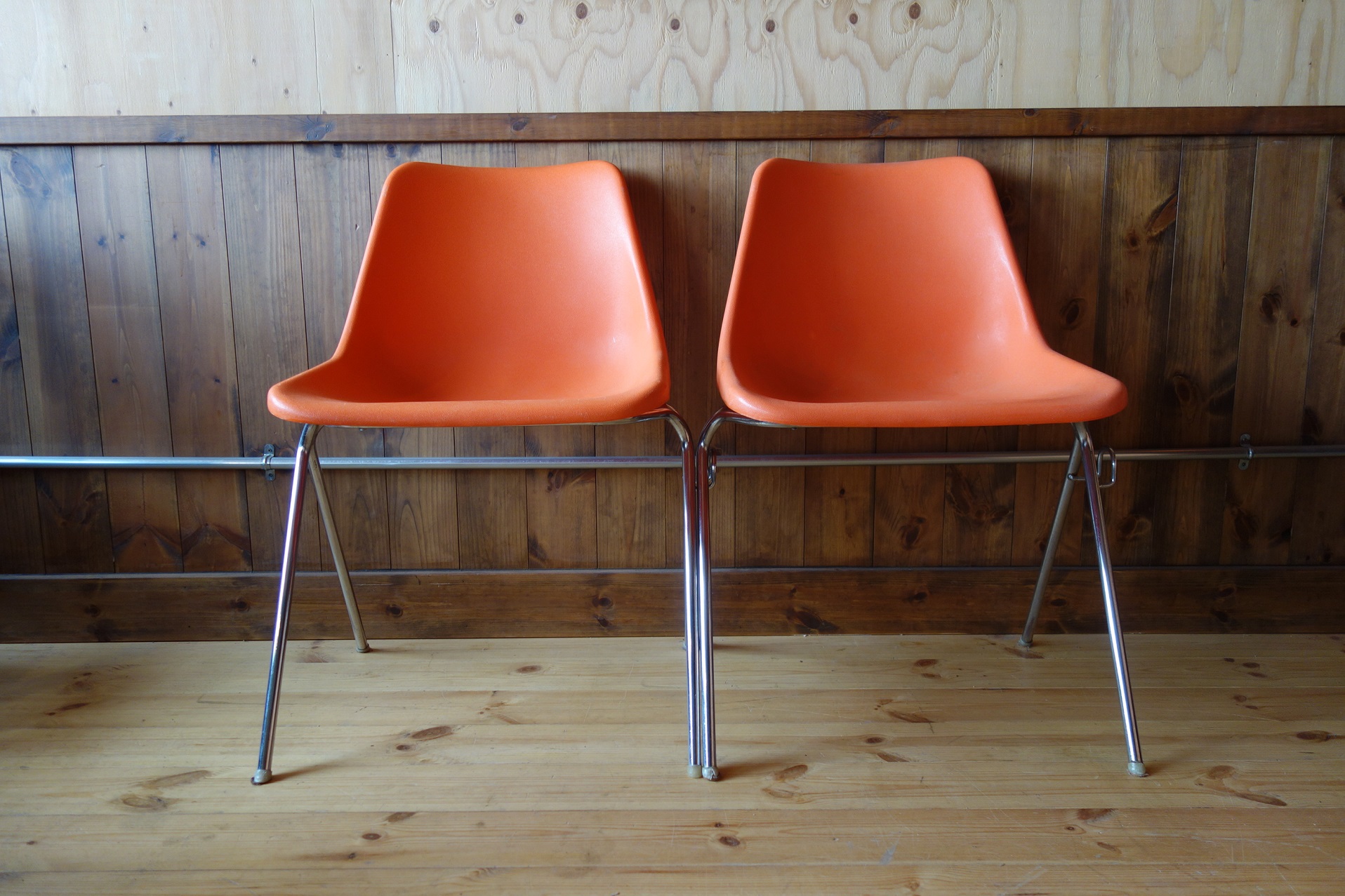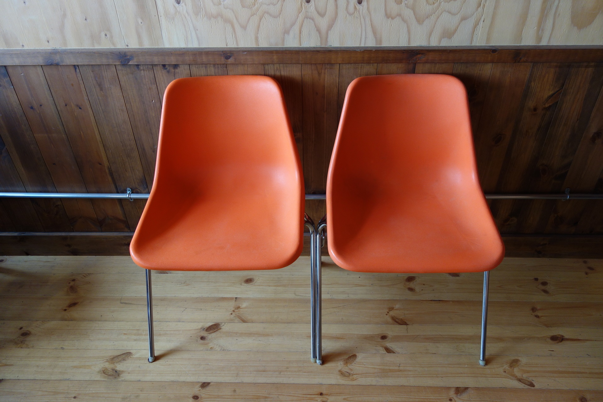 元々、イギリスのHille社がライセンス生産していましたが、今回の物は珍しい、スウェーデンのOverman社製の物になります。鮮やかなオレンジ色が美しいこの椅子は、スタッキングと連結が可能で、様々な場所で活用できます。2脚セットでの販売になります。