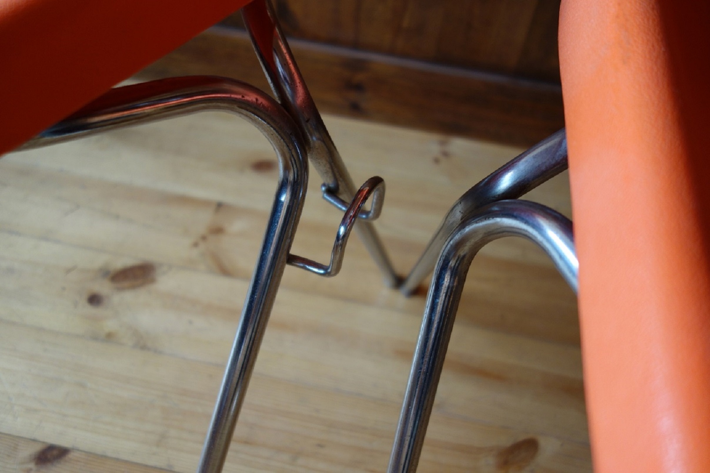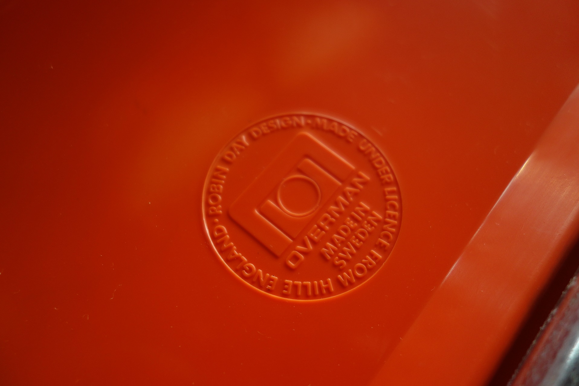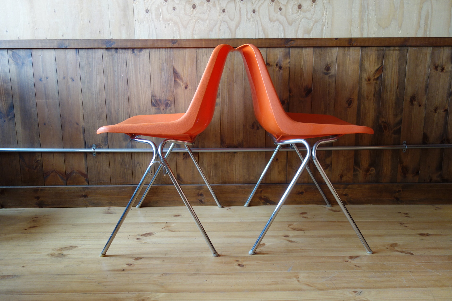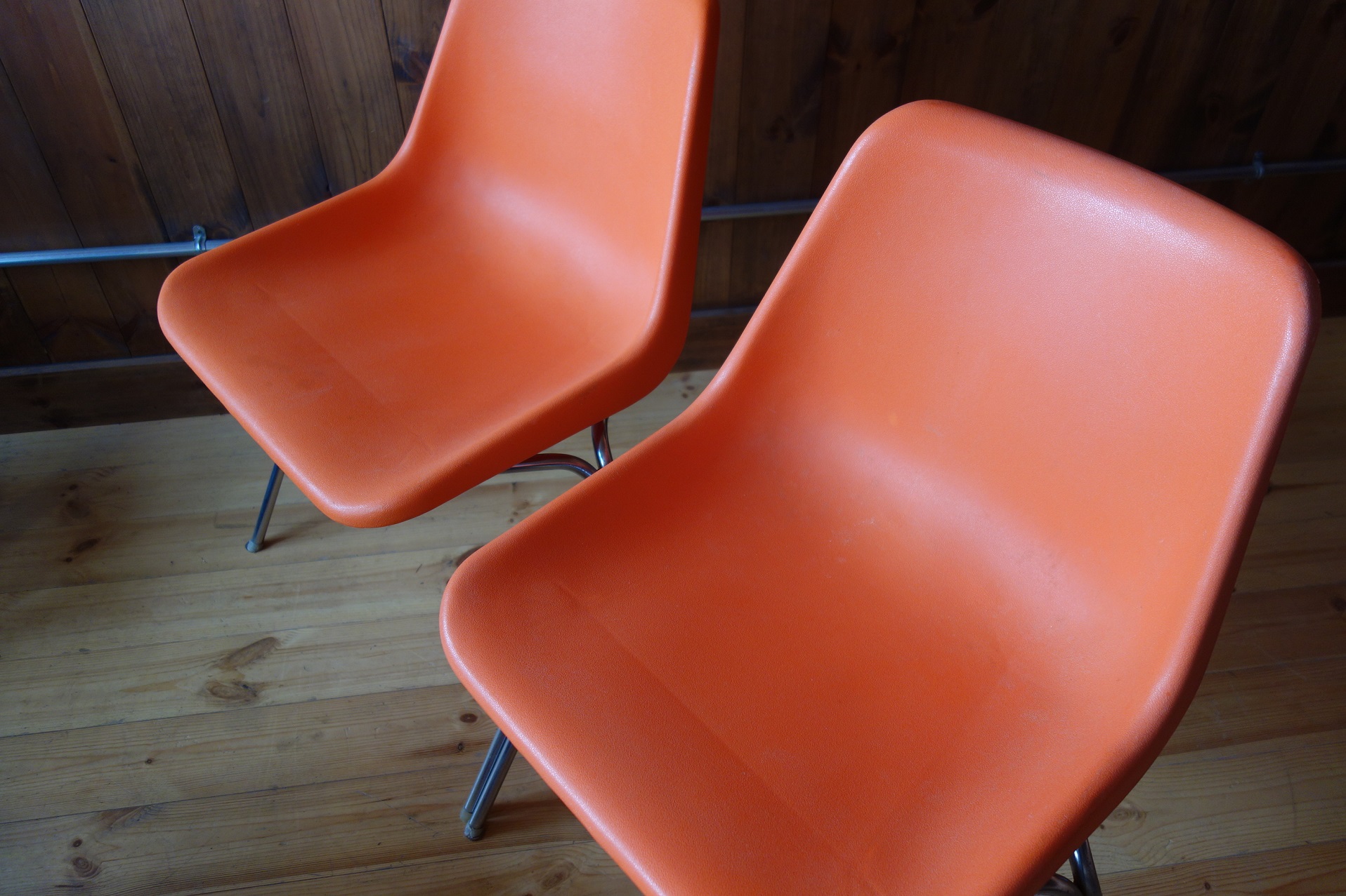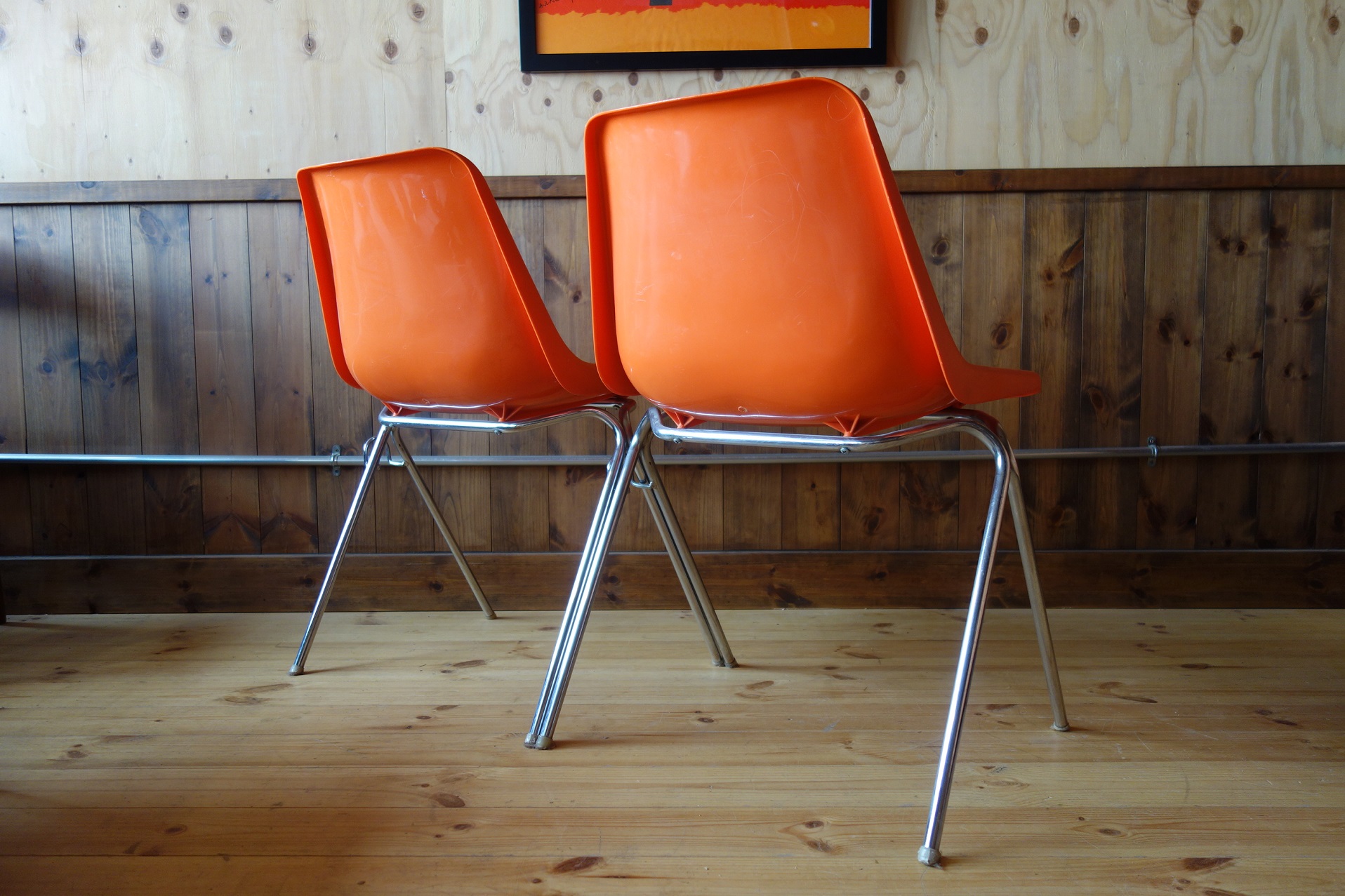 元々、イギリスのHille社がライセンス生産していましたが、今回の物は珍しい、スウェーデンのOverman社製の物になります。鮮やかなオレンジ色が美しいこの椅子は、スタッキングと連結が可能で、様々な場所で活用できます。2脚セットでの販売になります。