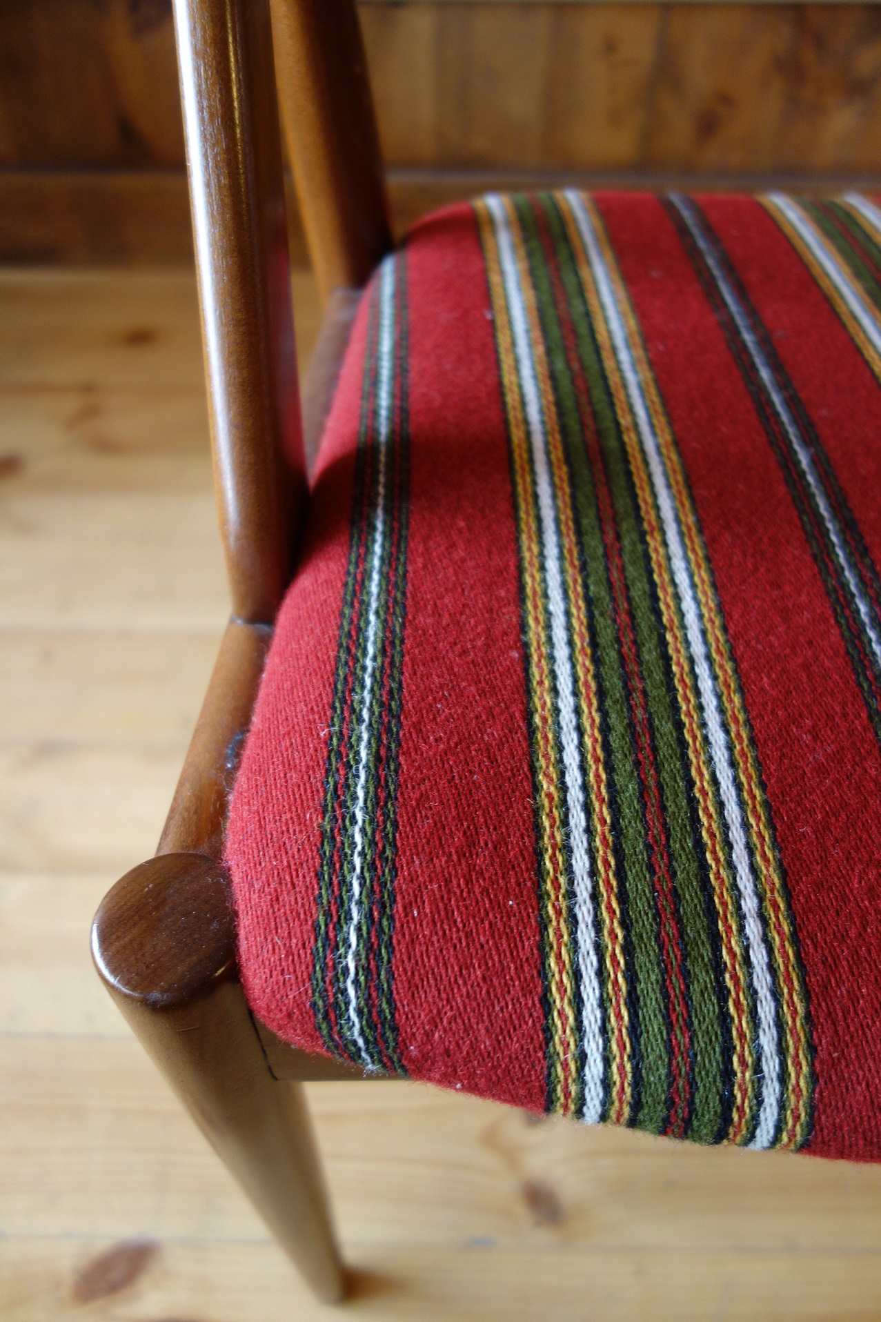 今回の椅子は、本体がアフリカンチーク(Afrormisia)材のラッカー仕上げに、生地はデンマークの老舗生地メーカー"Kjellerup Vaeveri社"の7100(Wool+Cotton/45000martindale)の赤で張り替えました。