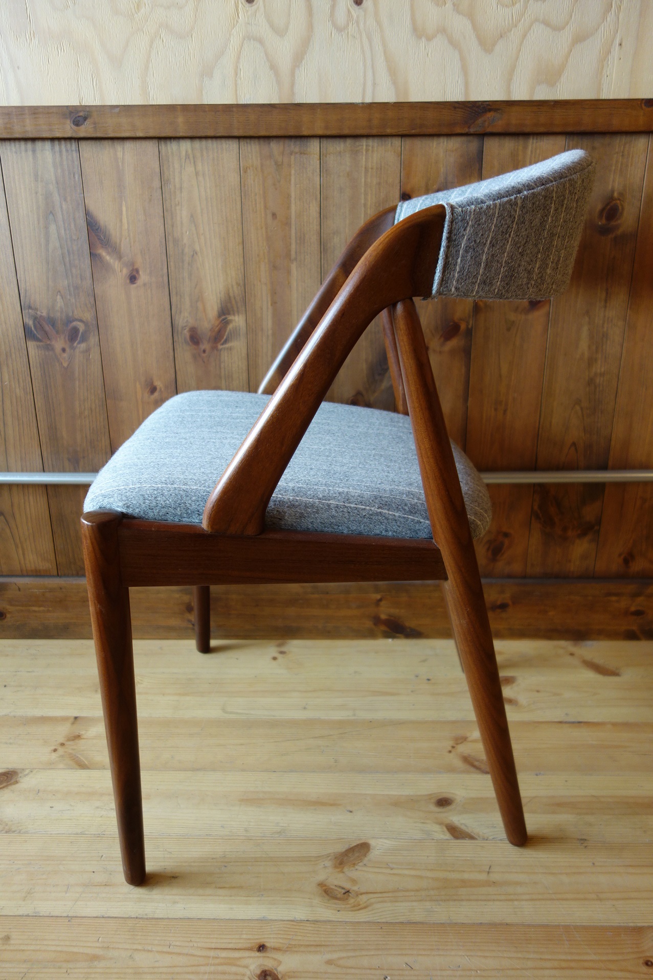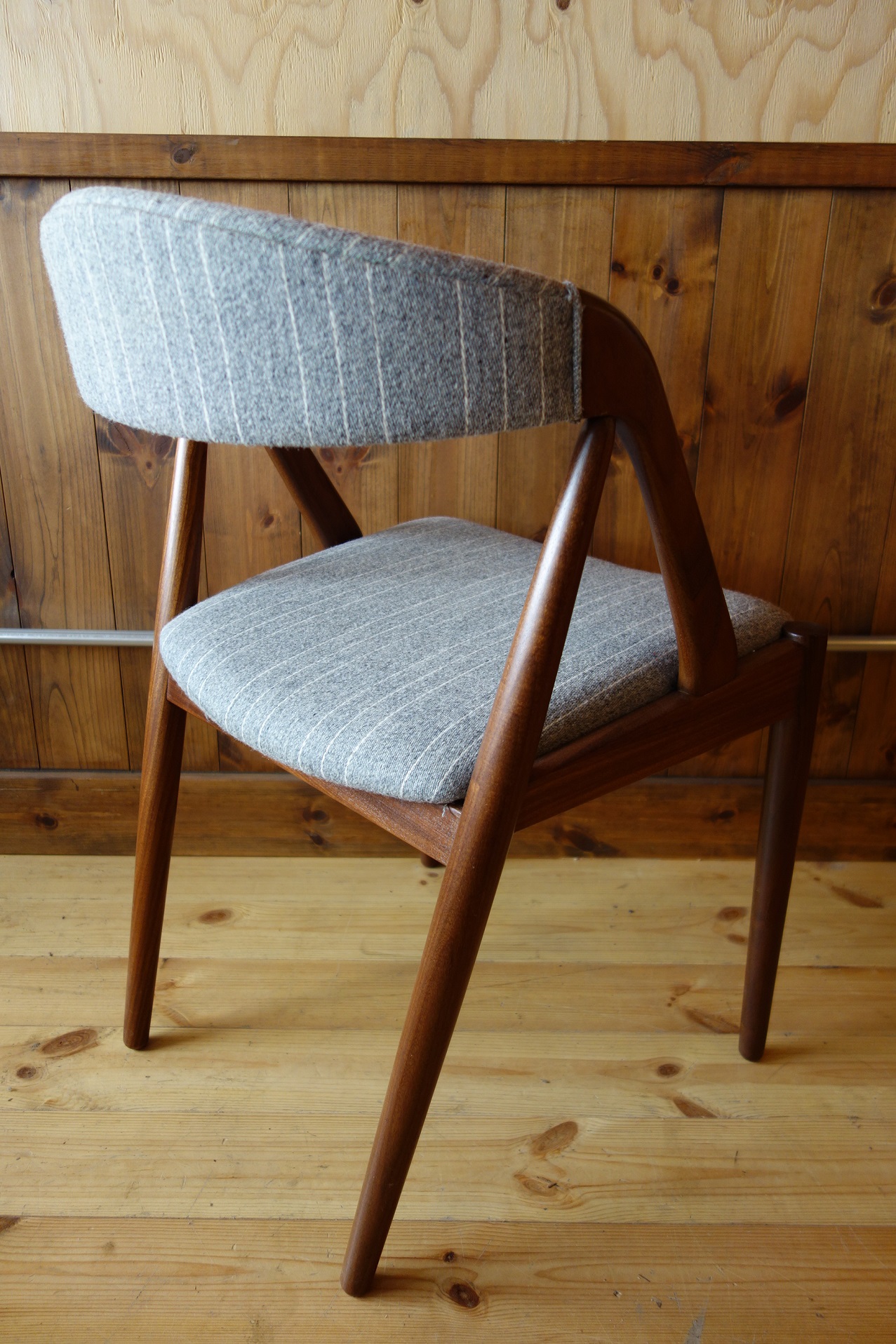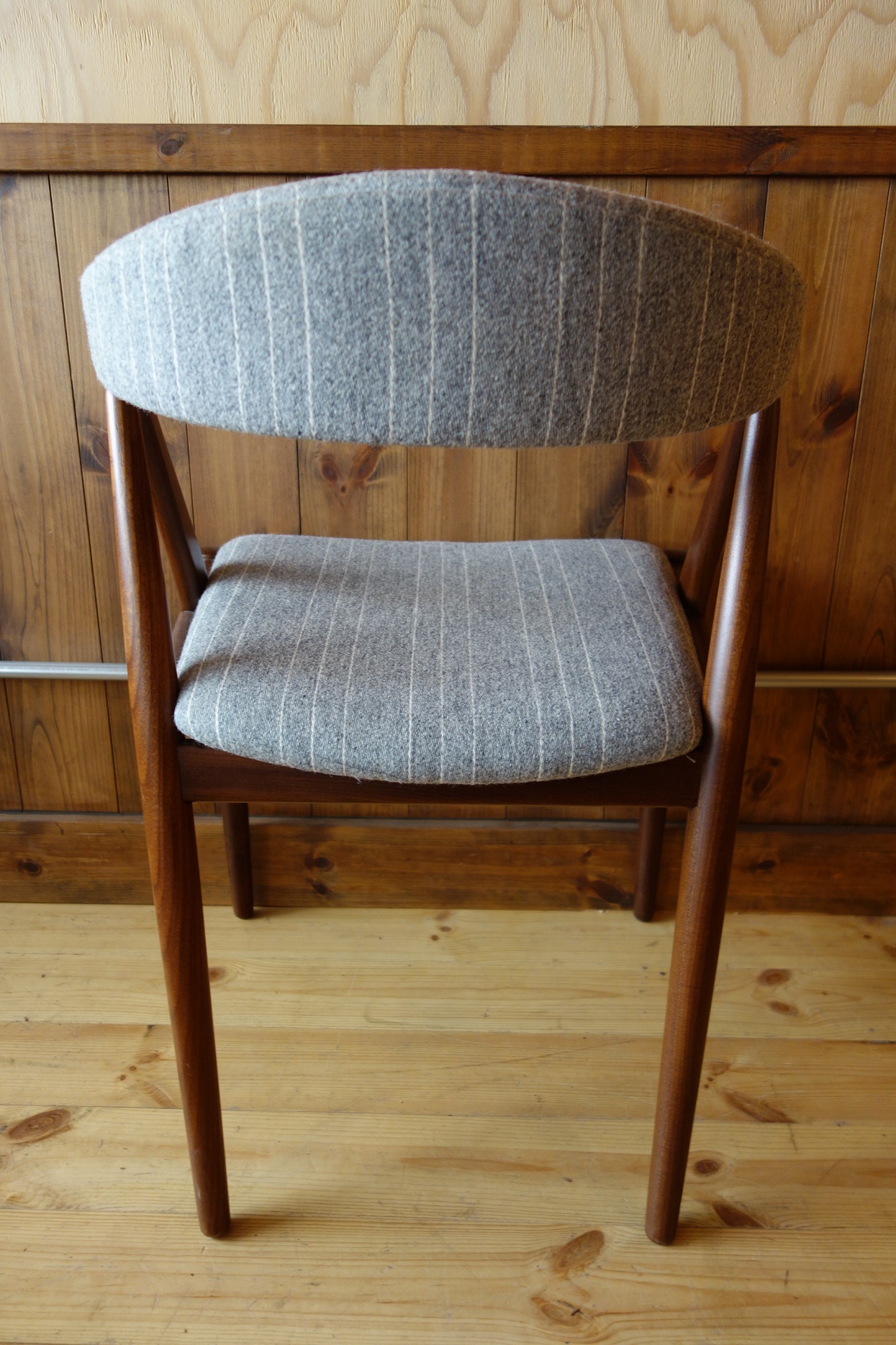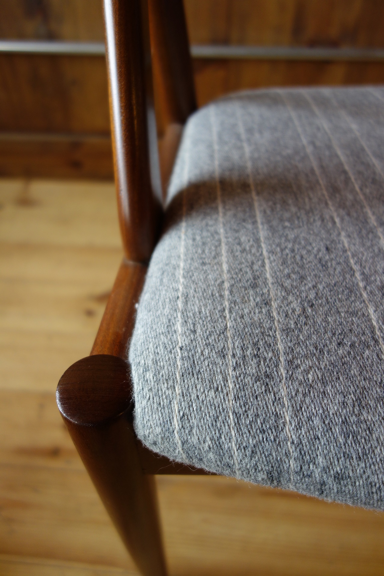 今回の椅子は、本体がアフリカンチーク(Afrormisia)材のラッカー仕上げに、生地はデンマークの老舗生地メーカー"Kjellerup Vaeveri社"のSARA(Wool+Cotton/45000martindale)のグレーストライプで張り替えました。