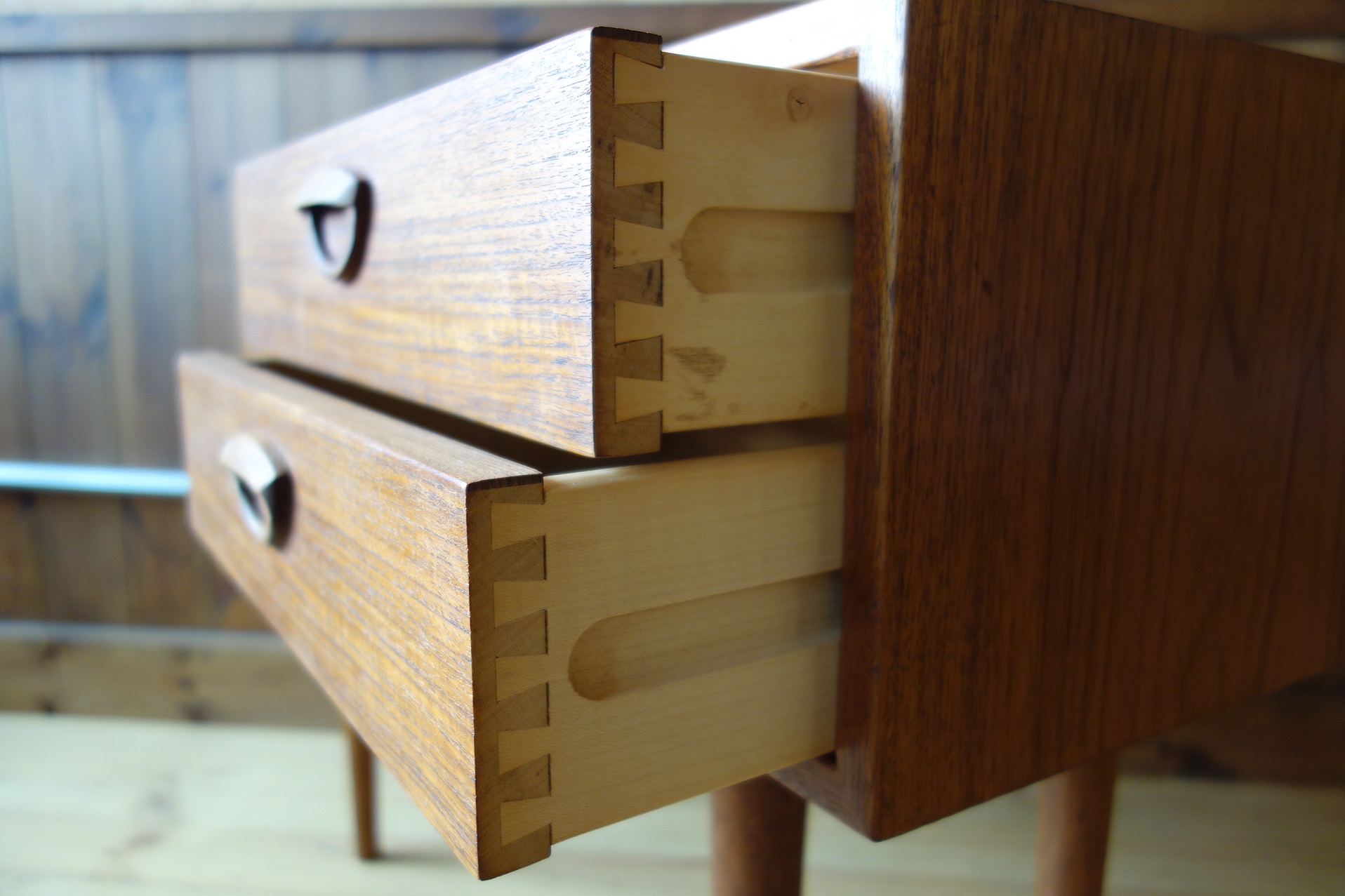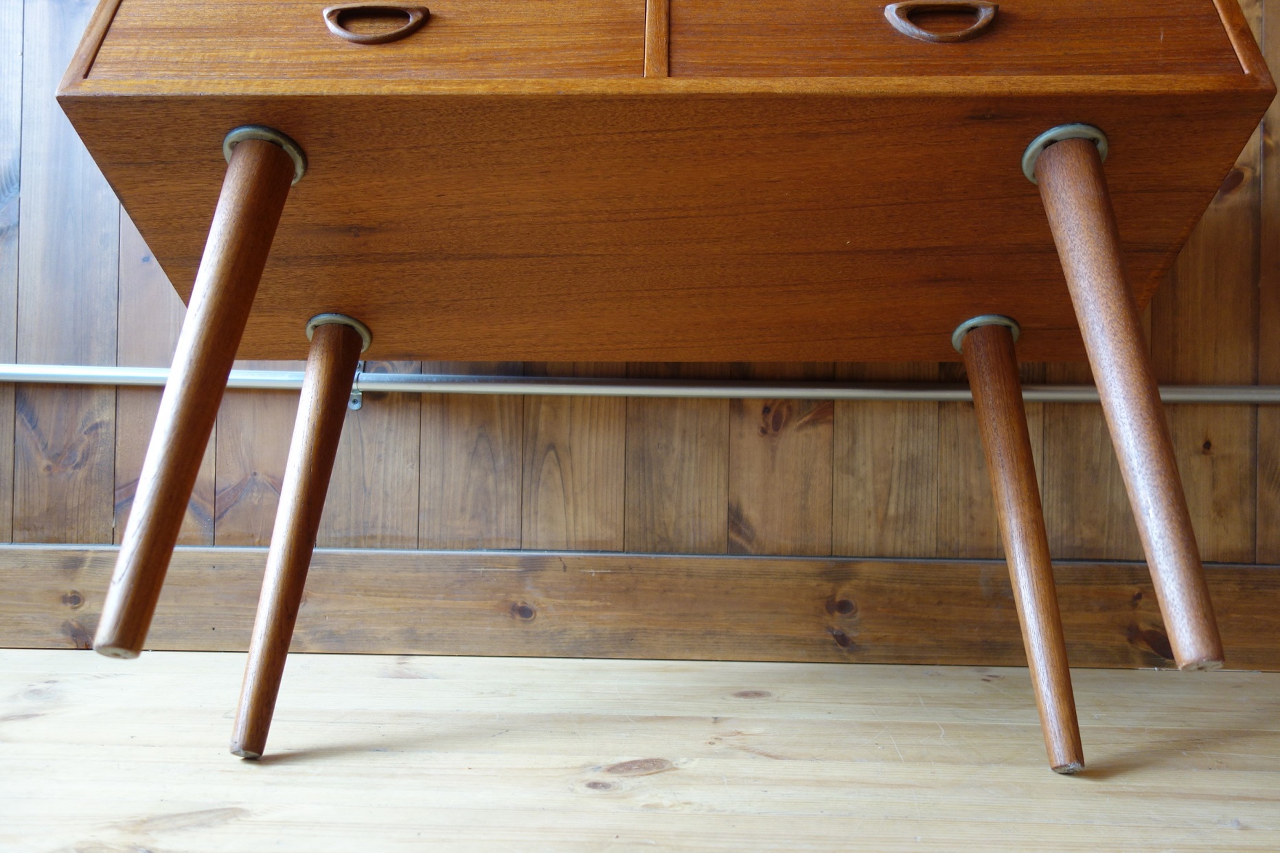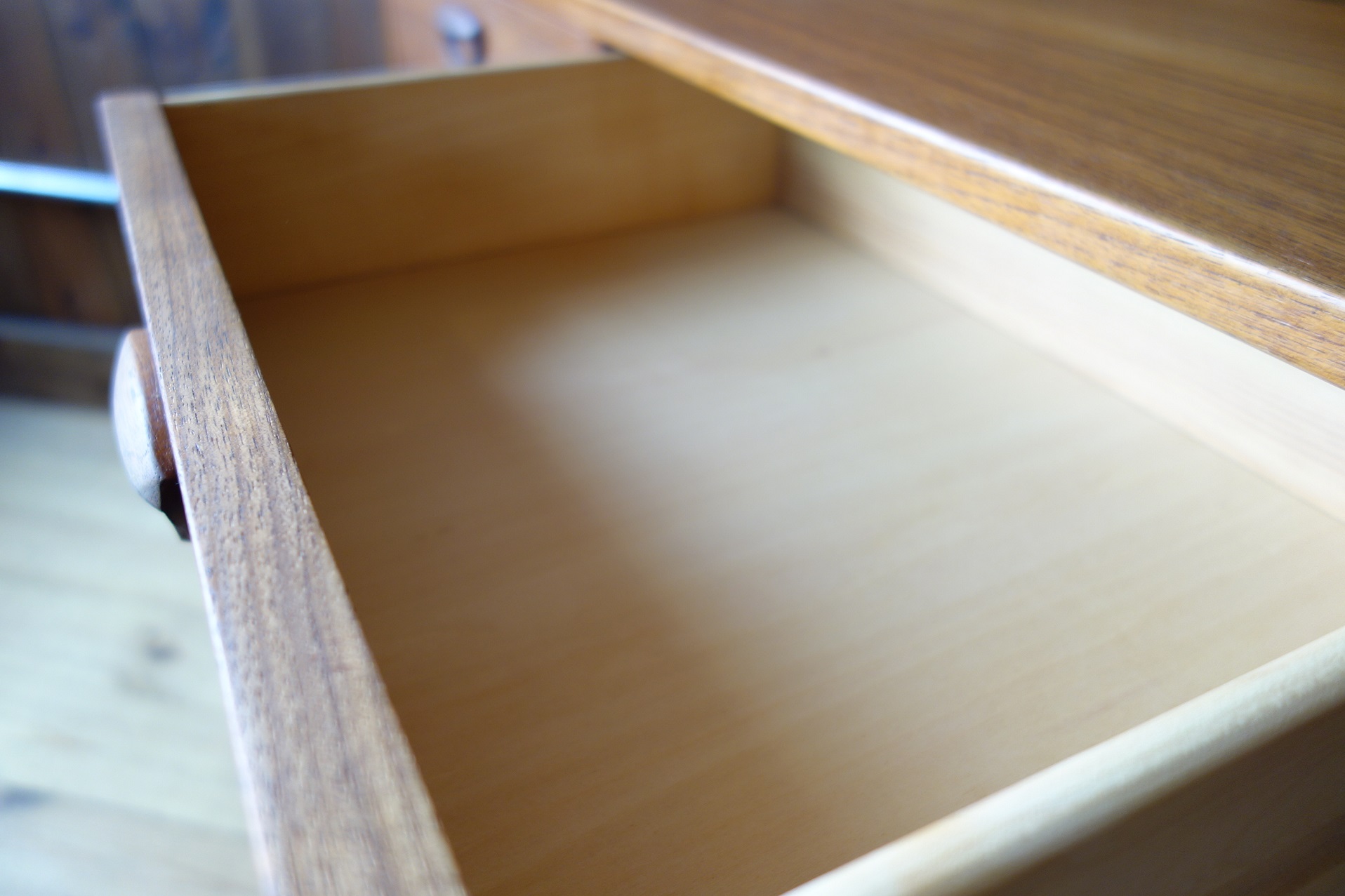 Kai Kristiansenの家具は、昔から椅子より箱物の方が現地では評価が高く、価格も高かったです。今では希少なアイテムになっていますので、なかなか入手が難しいアイテムでもあります。非常に作りも良く、しっかりとした家具で、長い脚と引き出しの持ち手のデザインが特徴的なチェストです。
