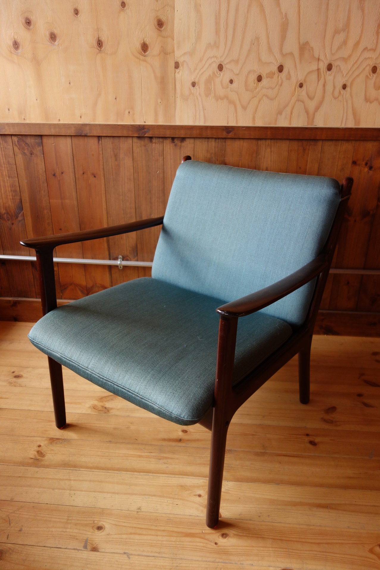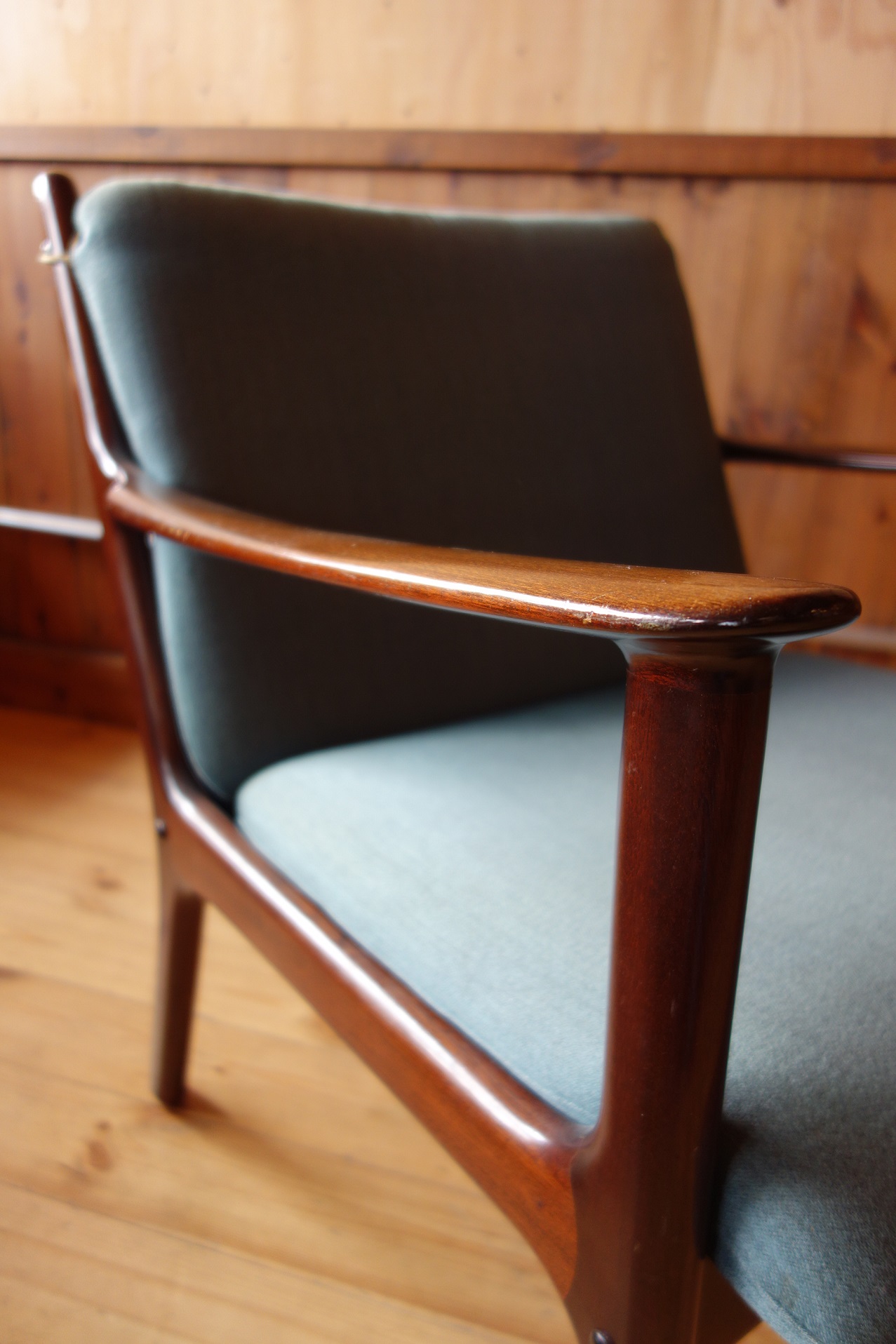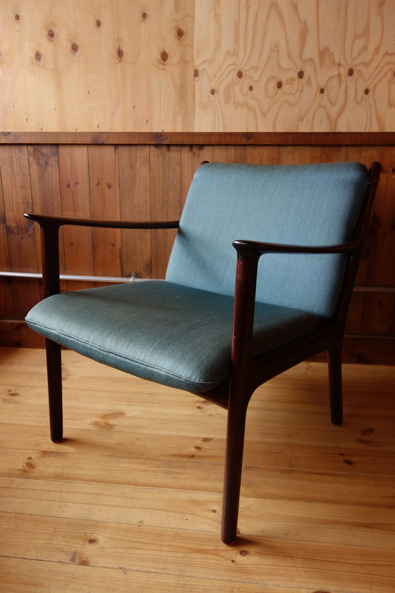デンマークのデザイナーでありながら、教授でもある"Professor" Ole Wanscherにより1962年代にデザインされたEasy Chairです。安楽性よりも、しっかりと座っても苦にならないような設計の椅子と言えます。そもそもWanscherのEasy Chairは、そうしたスタイルばかりなのですが・・・メーカー"P.Jeppesen Mobelfabrik"社によって制作・販売されたものです。素材は、デンマークの家具では、あまり使用されない「マホガニー」で、座面は基本的にはウレタンフォームですが、お好みでお選びいただけます。本体のマホガニーも、仕上げ方で色合いや風合いが変わりますので、お客様のお好みに合わせて仕上げ直します。