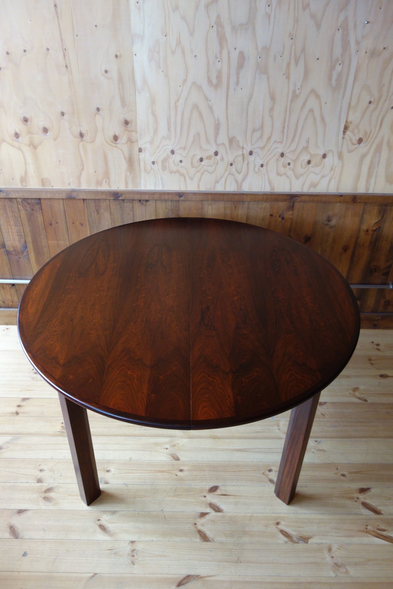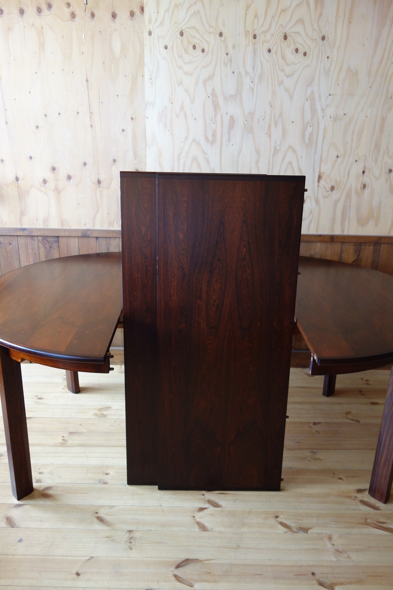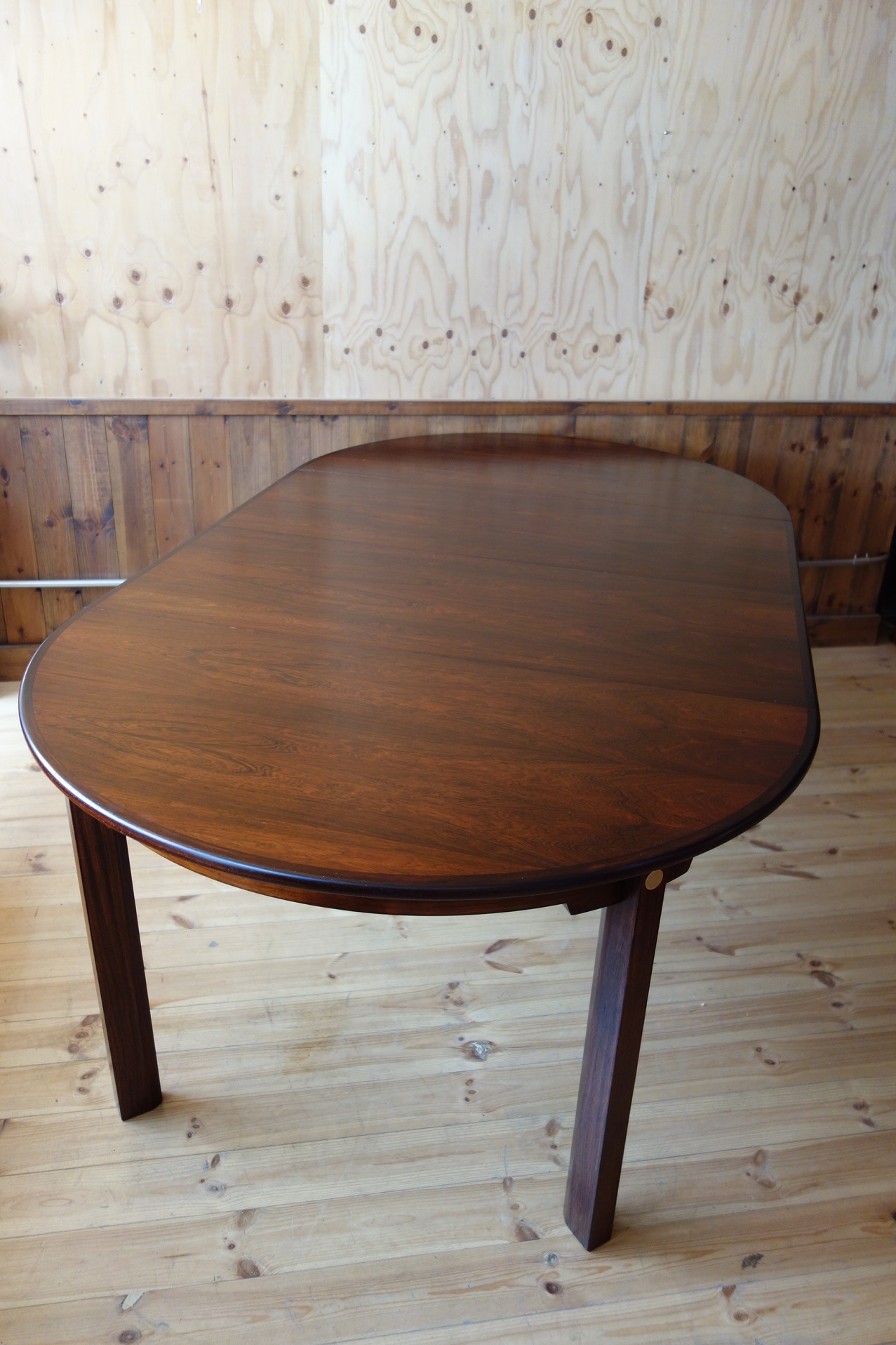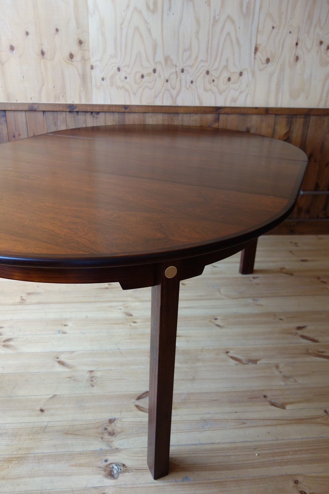 モーエンセンの拡張式円形ダイニングテーブルです。Oresund Seriesと呼ばれている家具シリーズは、テーブルの他、箱物を多く作っていました。どれもシンプルながら造りが良いのが特徴です。このテーブルもモーエンセンらしいシンプルで機能的なデザインなのですが、脚の形状と付け根の真鍮にモーエンセンのこだわりが見て取れます。素材はローズウッドで、マットなラッカーで仕上げました。約50cmのエクステンションが2枚付きます。