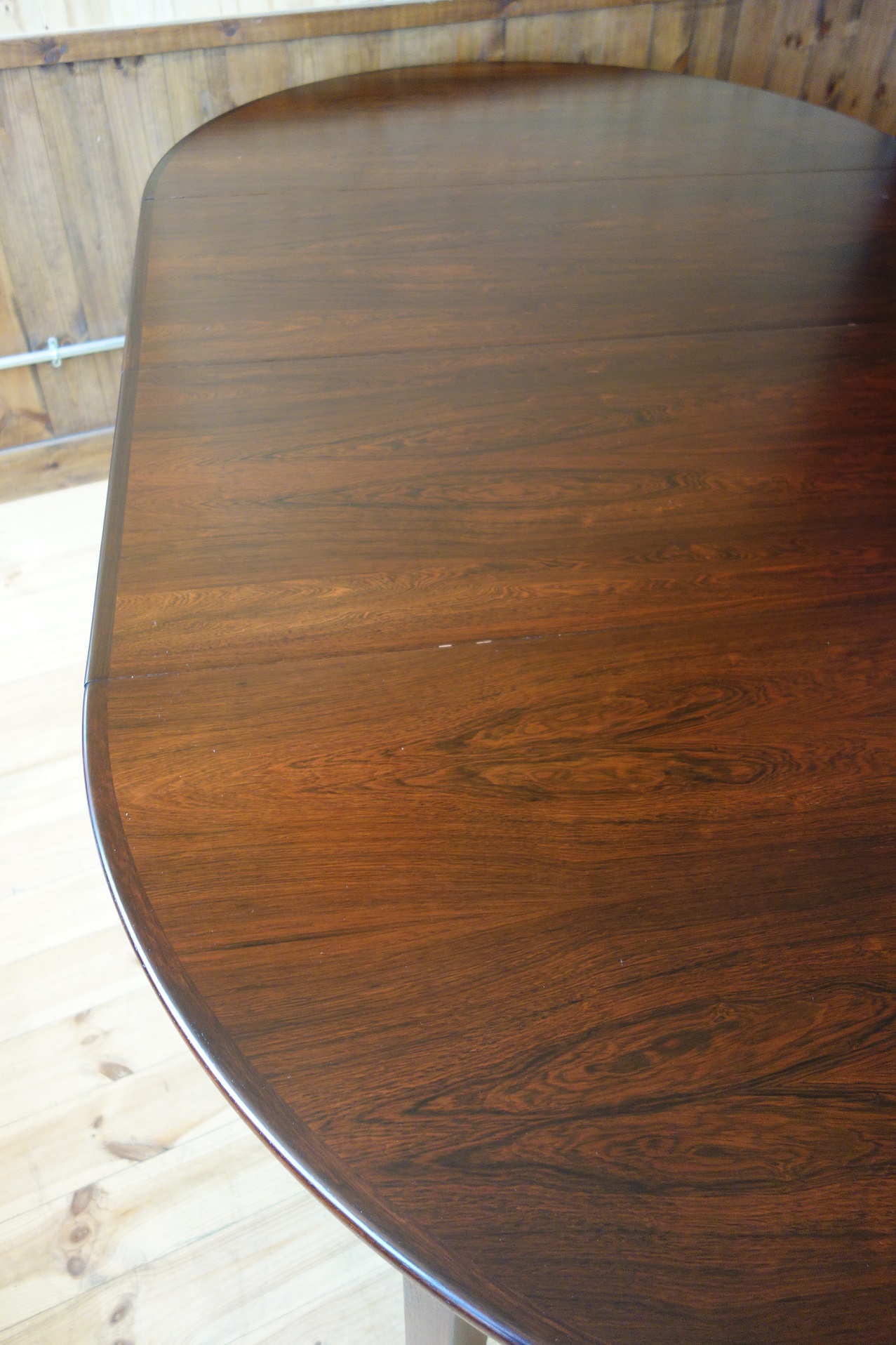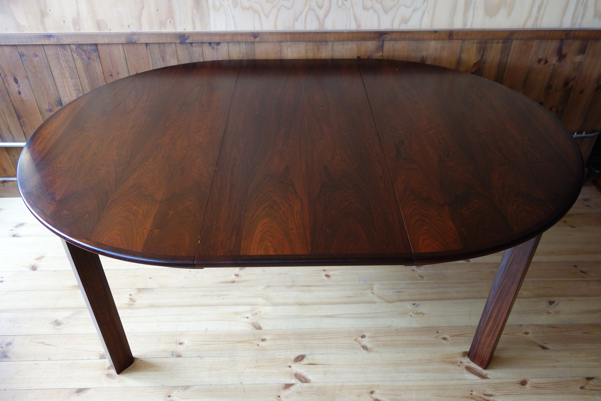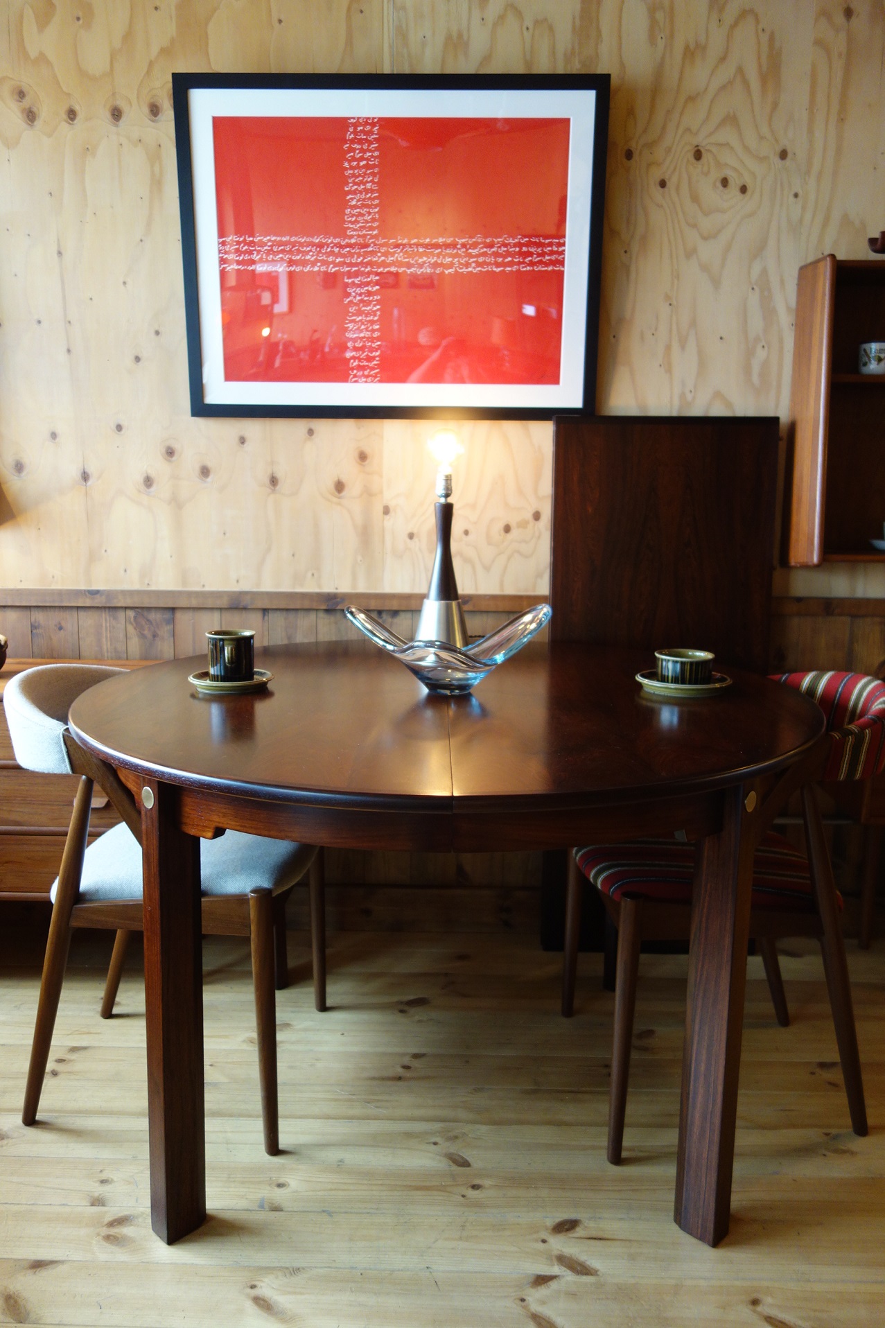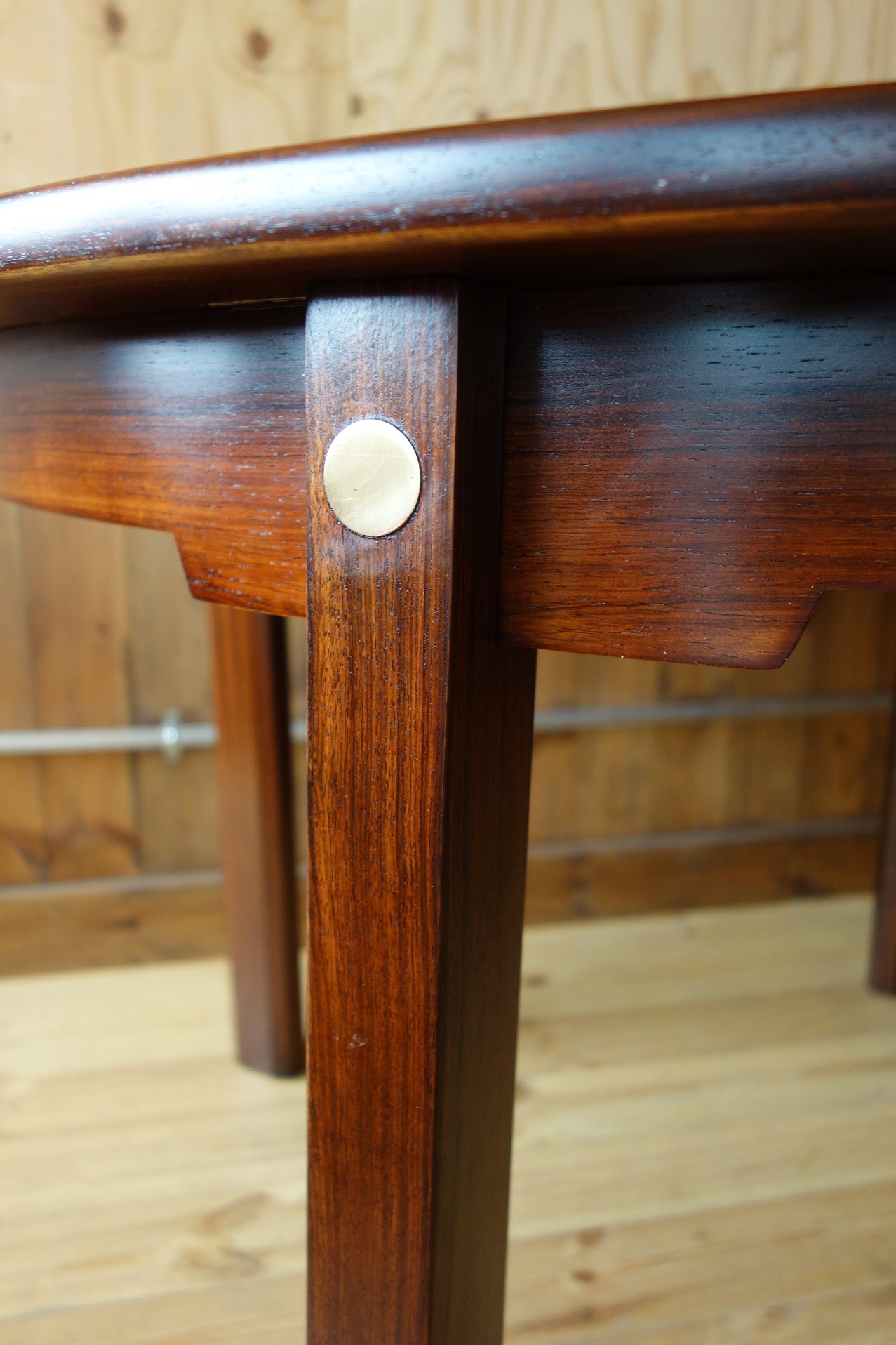 モーエンセンの拡張式円形ダイニングテーブルです。Oresund Seriesと呼ばれている家具シリーズは、テーブルの他、箱物を多く作っていました。どれもシンプルながら造りが良いのが特徴です。このテーブルもモーエンセンらしいシンプルで機能的なデザインなのですが、脚の形状と付け根の真鍮にモーエンセンのこだわりが見て取れます。素材はローズウッドで、マットなラッカーで仕上げました。約50cmのエクステンションが2枚付きます。