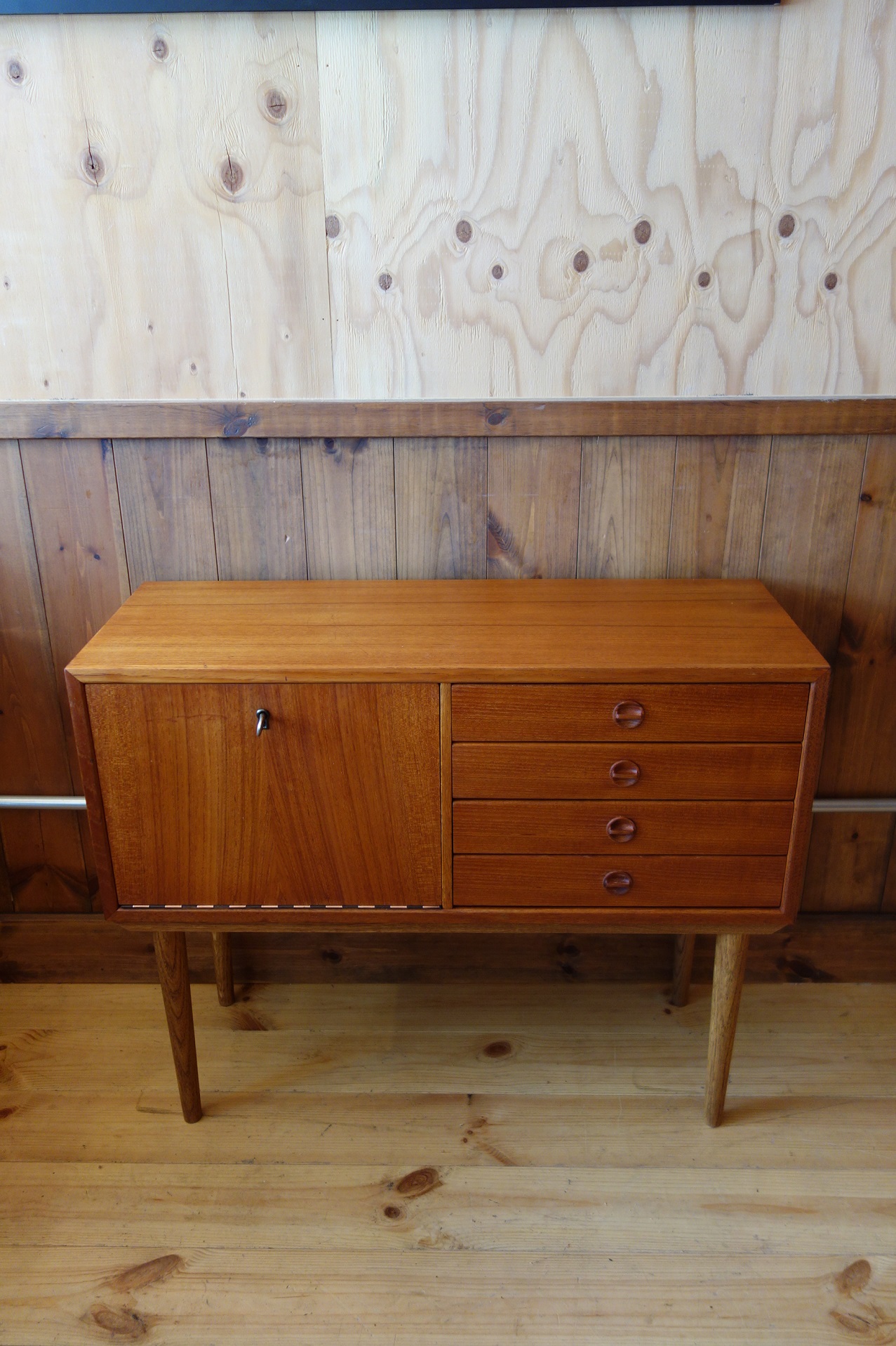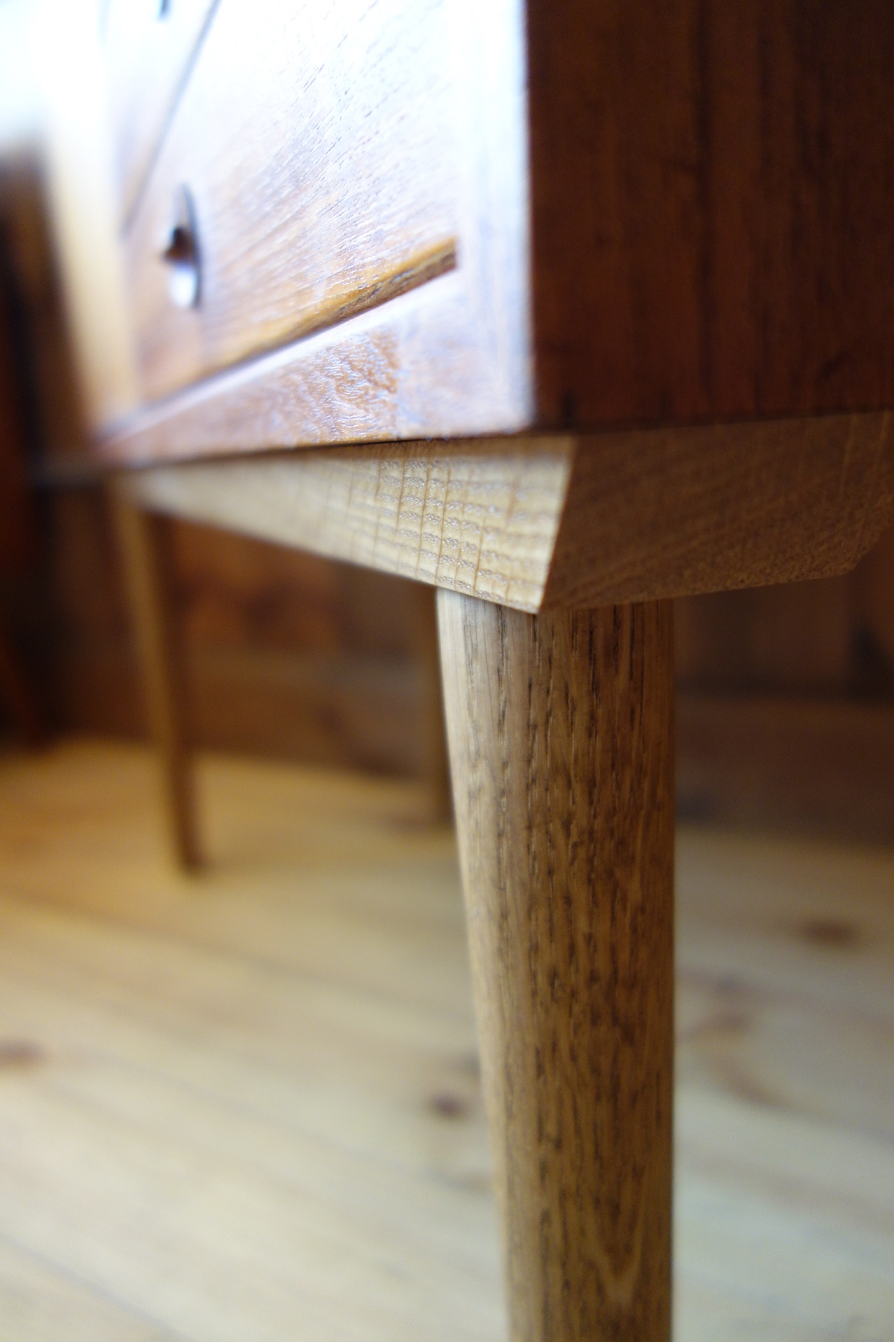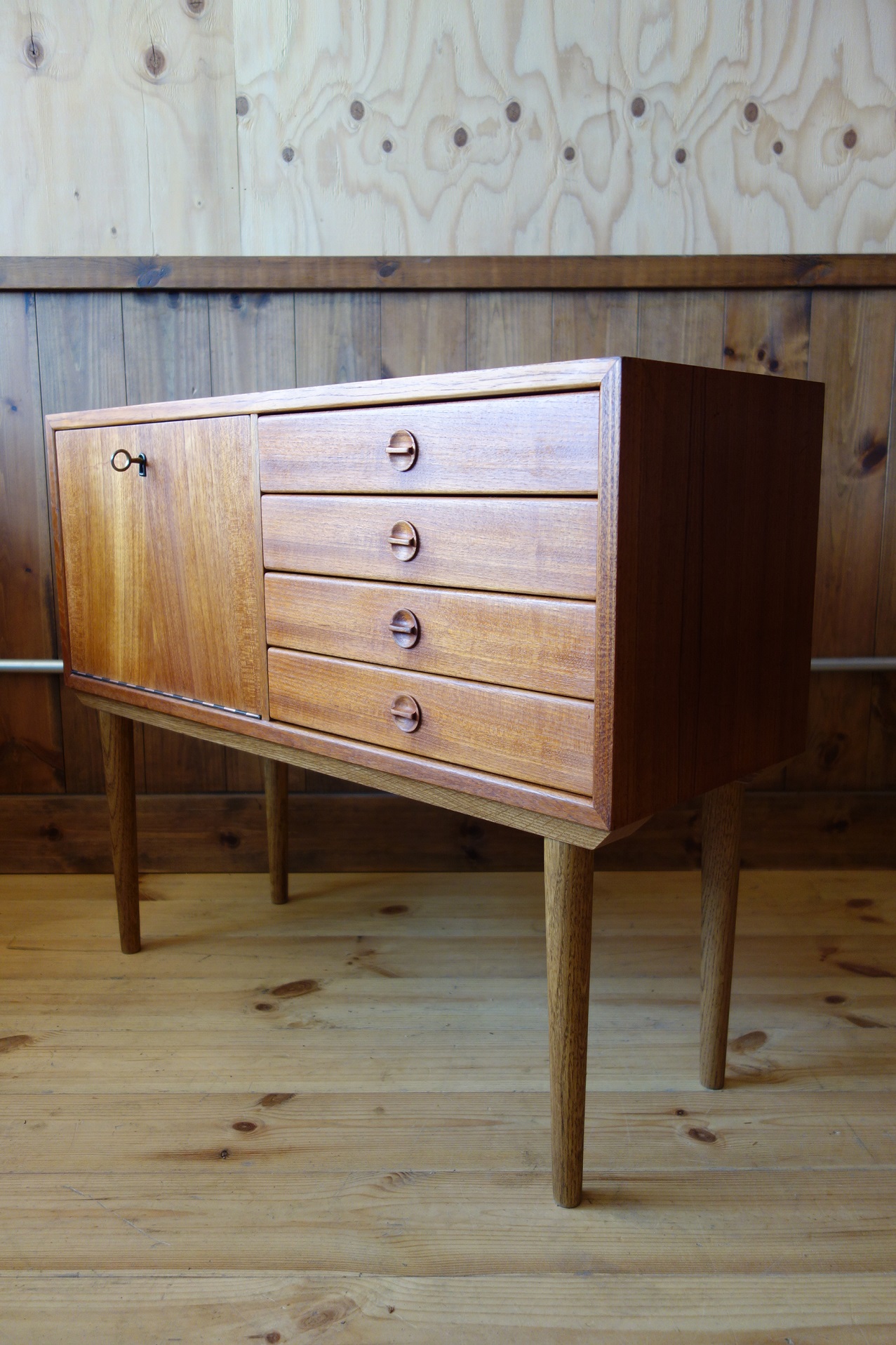 珍しいサイズの小さなサイドボードです。背面のパーツから、元々、壁付けの家具かと思われ、脚はありませんでしたので、オーク材で製作し、取り付けました。