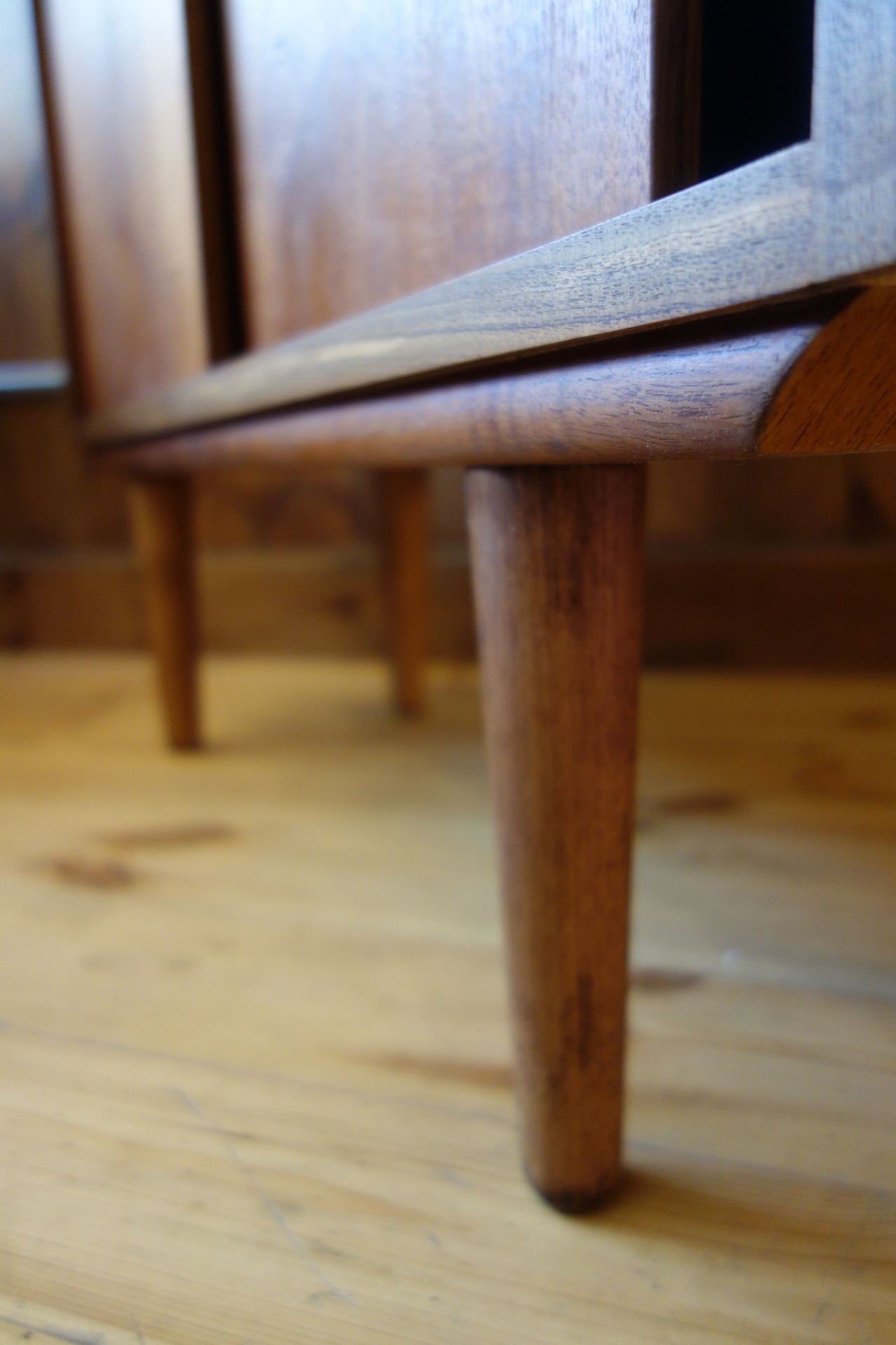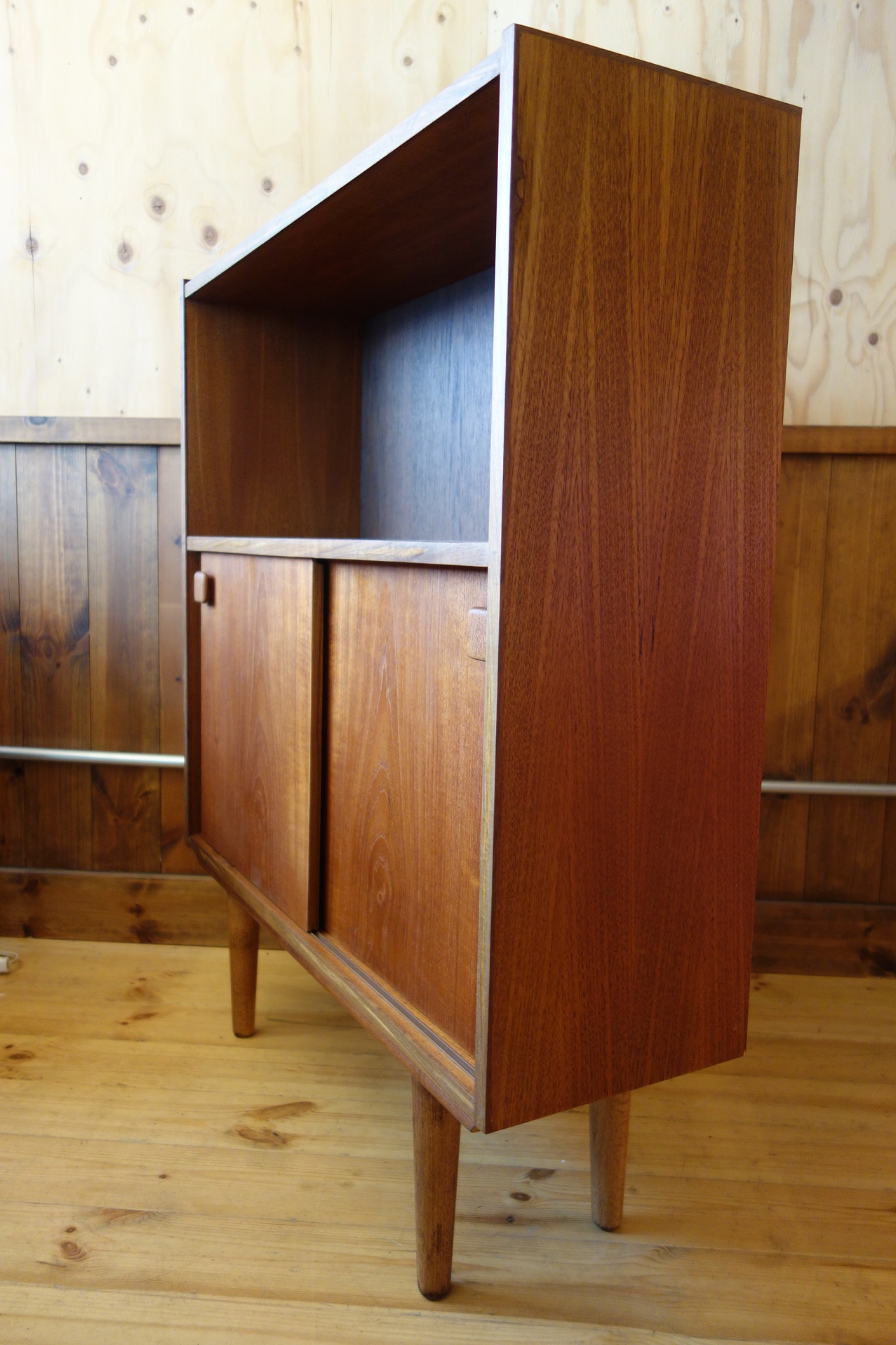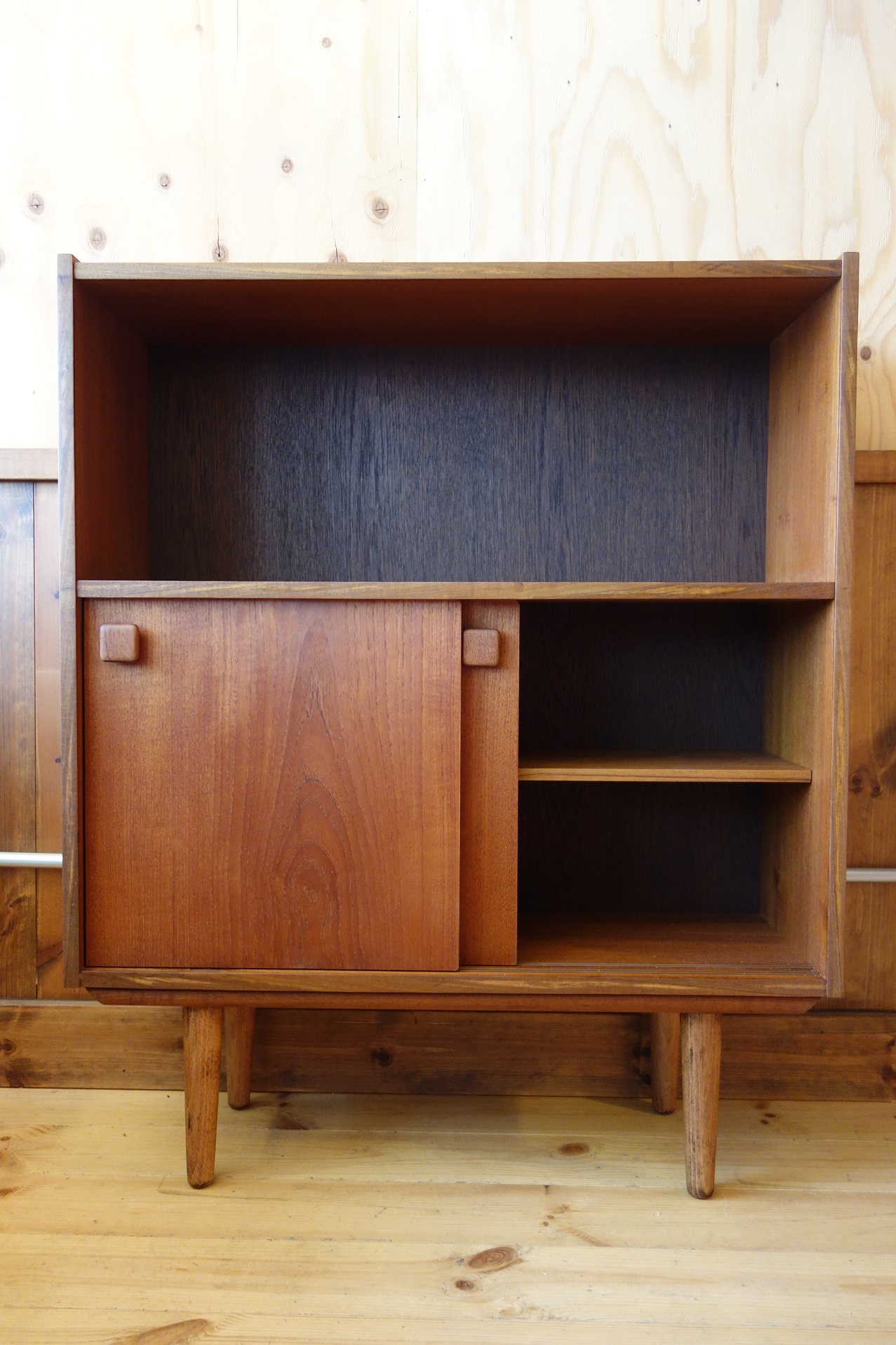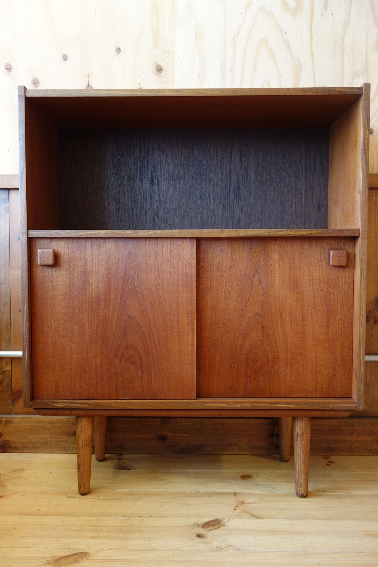 このサイズ感で引き戸が付く棚は意外にも珍しく、あまり見たことが無い家具です。脚は後付けかと思われ、取り外し可能なブナ材の脚となっています。また、木口(エッジ部分)はチーク材の突板が付いていましたが、無垢材に変更しています。