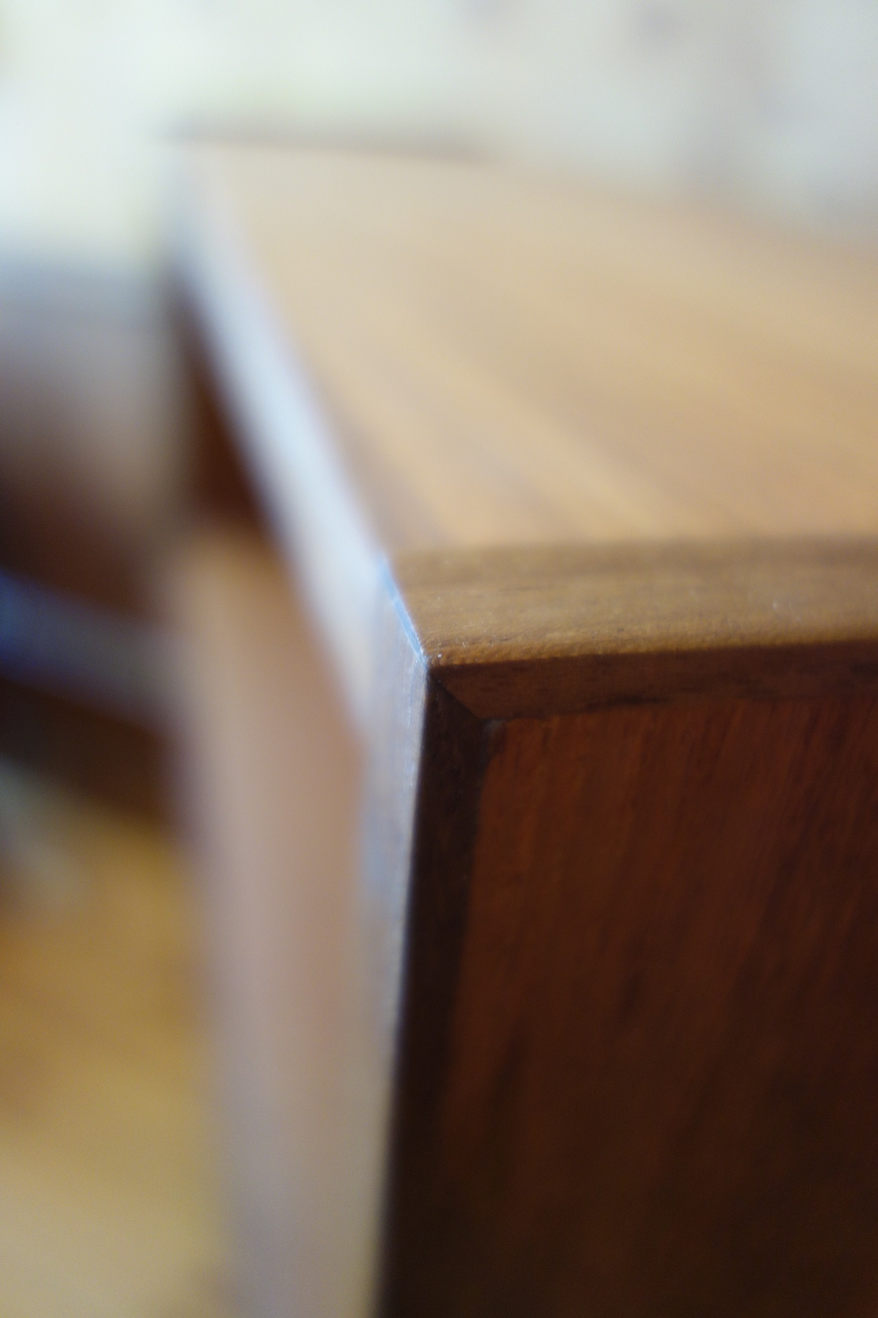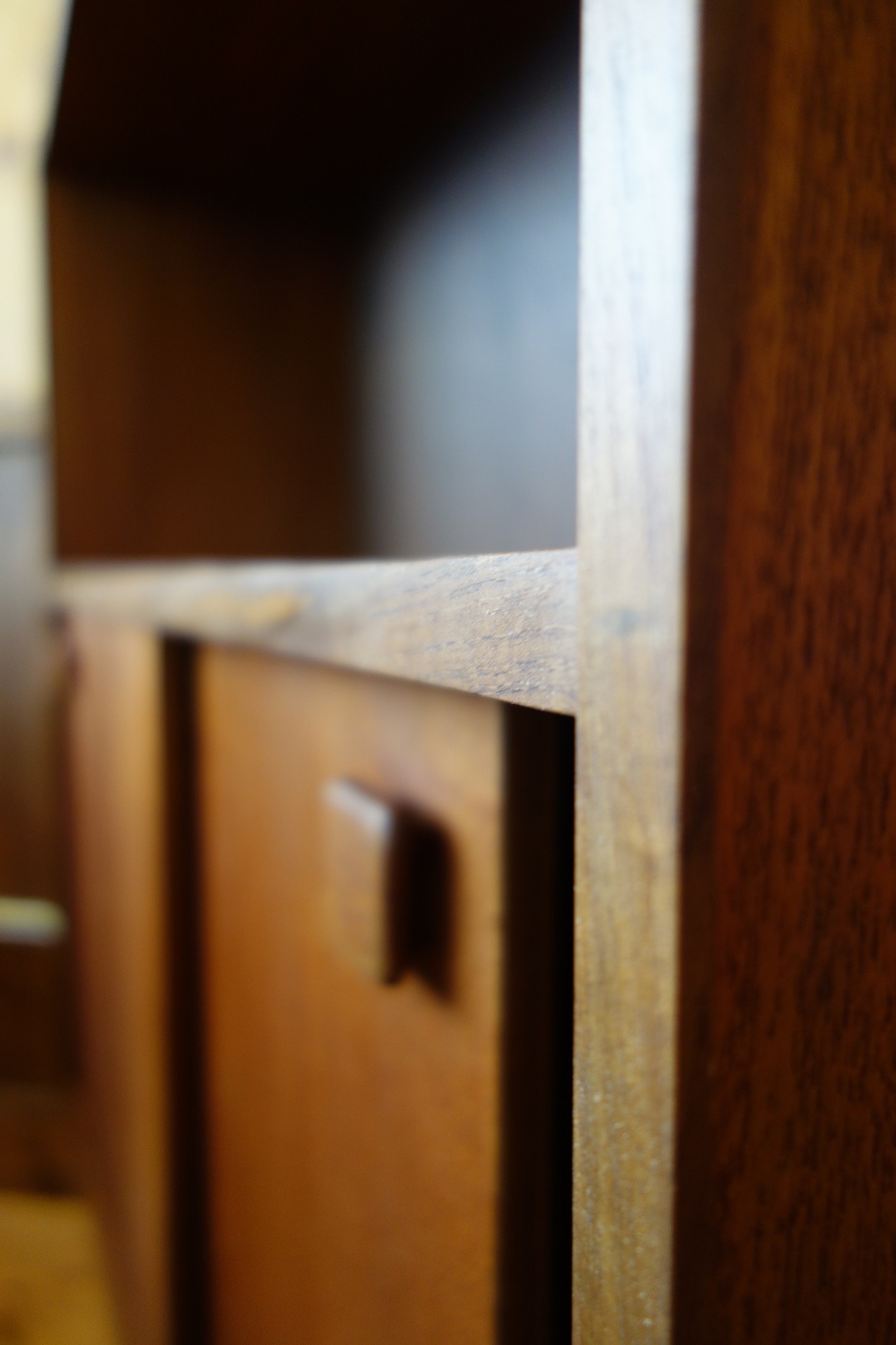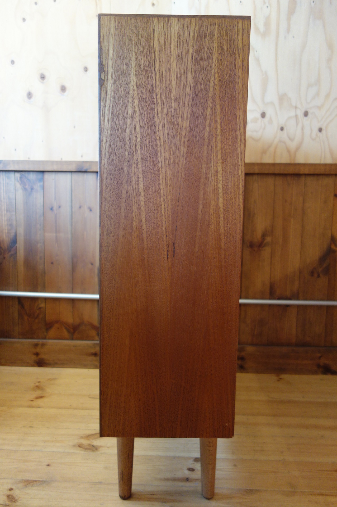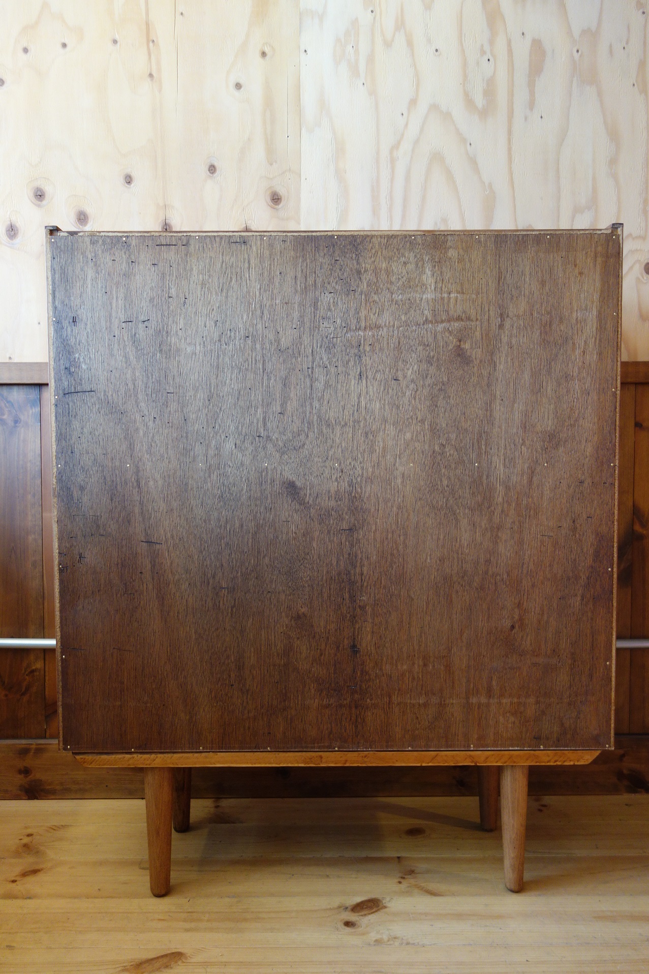 このサイズ感で引き戸が付く棚は意外にも珍しく、あまり見たことが無い家具です。脚は後付けかと思われ、取り外し可能なブナ材の脚となっています。また、木口(エッジ部分)はチーク材の突板が付いていましたが、無垢材に変更しています。