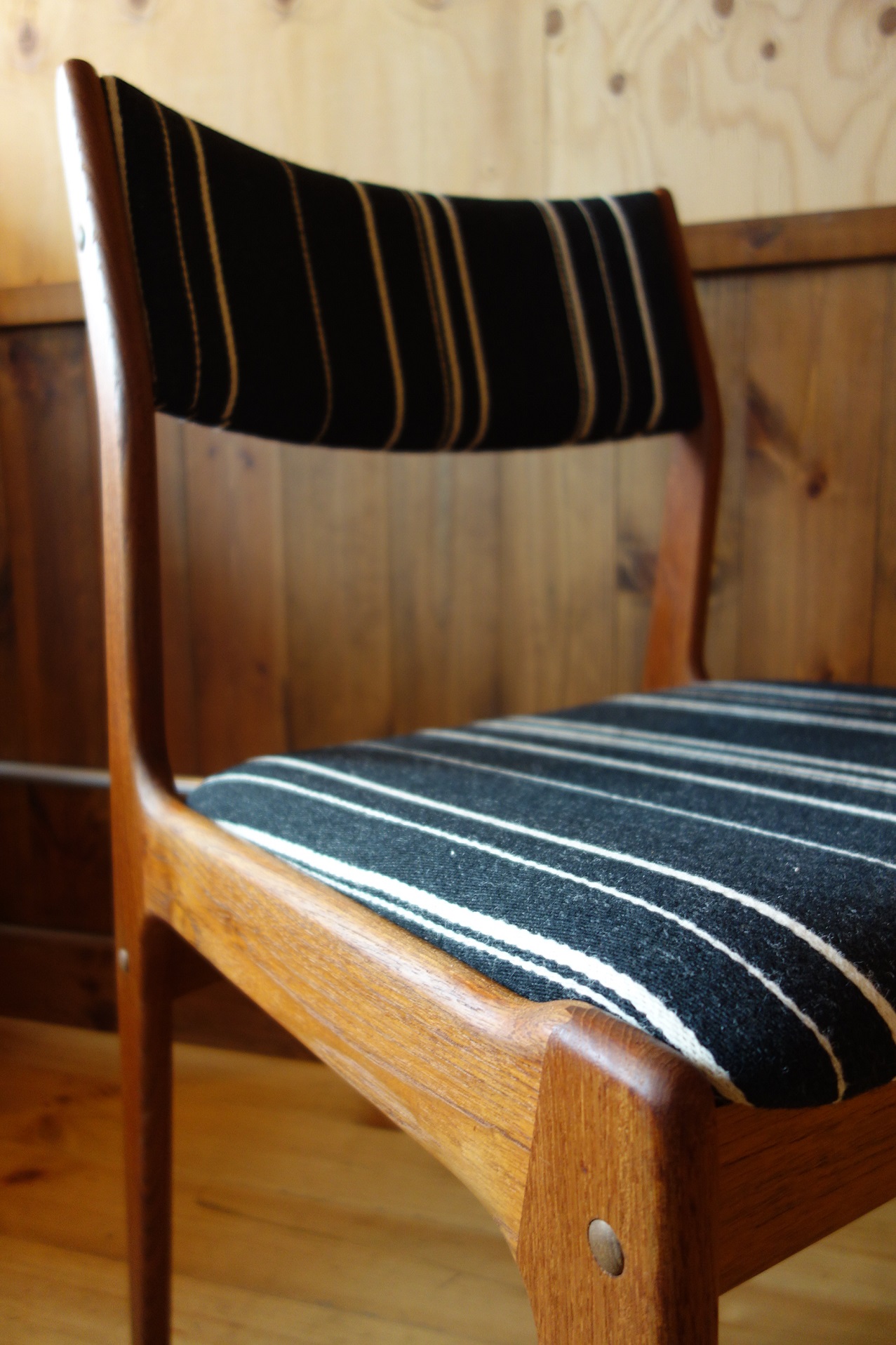 今回、生地をデンマークの老舗「Kjellerup Vaeveri」社のウールベースのストライプ生地で張り替えました。黒に白のストライプはランダムで、シックながら、モダンな印象を引き立てる柄になっています。