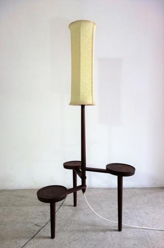 3つの円形テーブルが3本の脚に付く長細いシェードが特徴的な照明です。