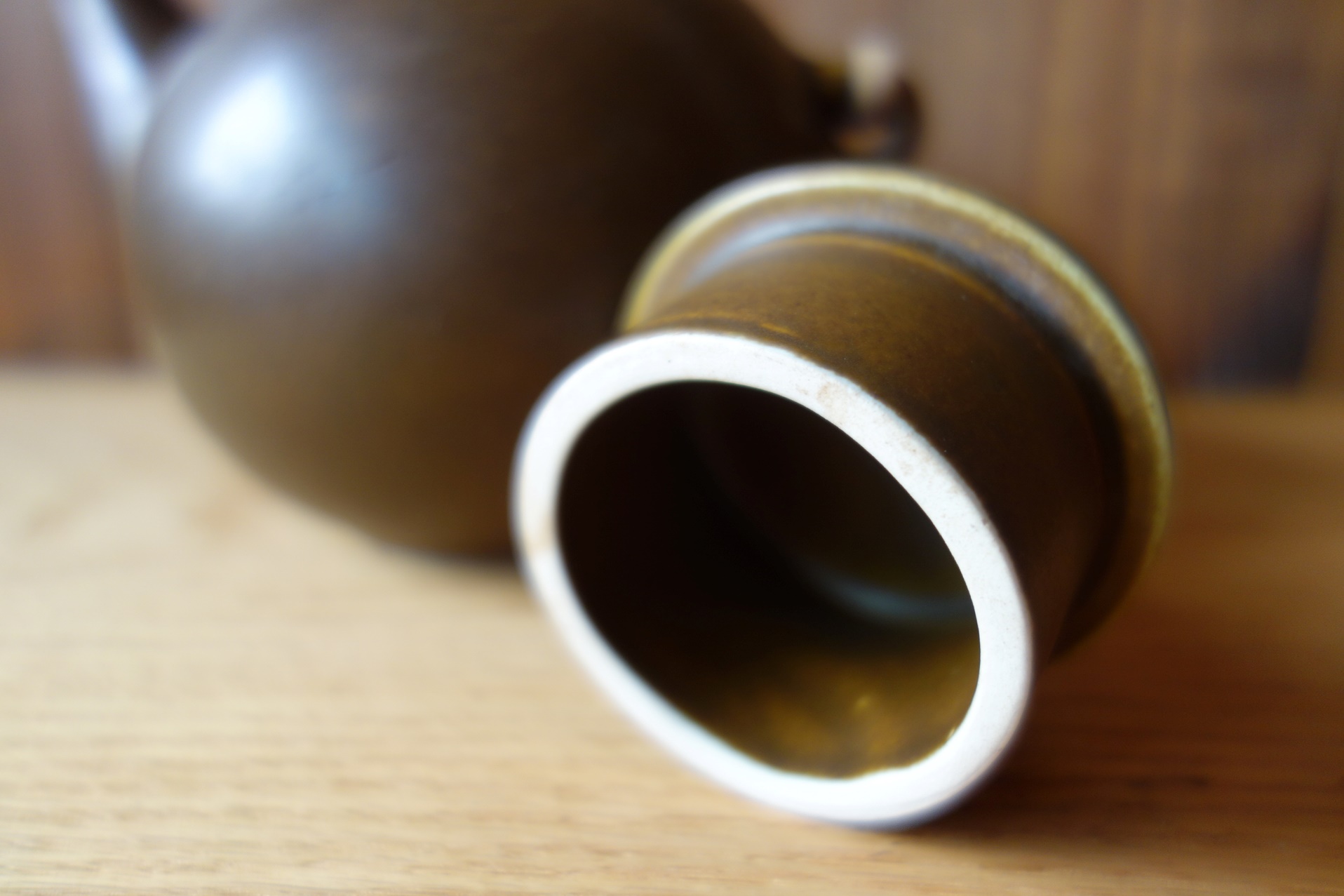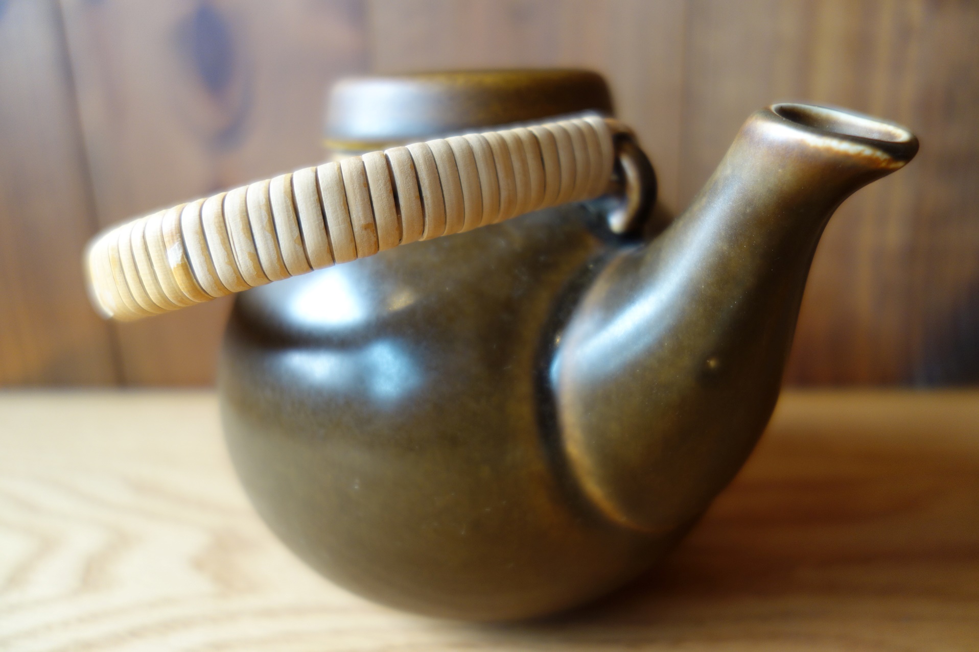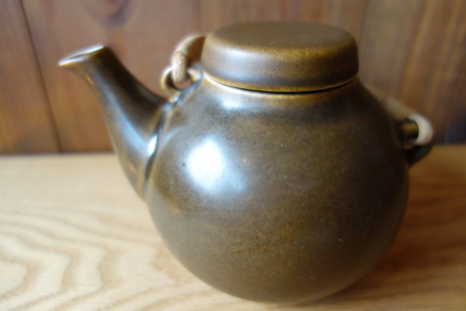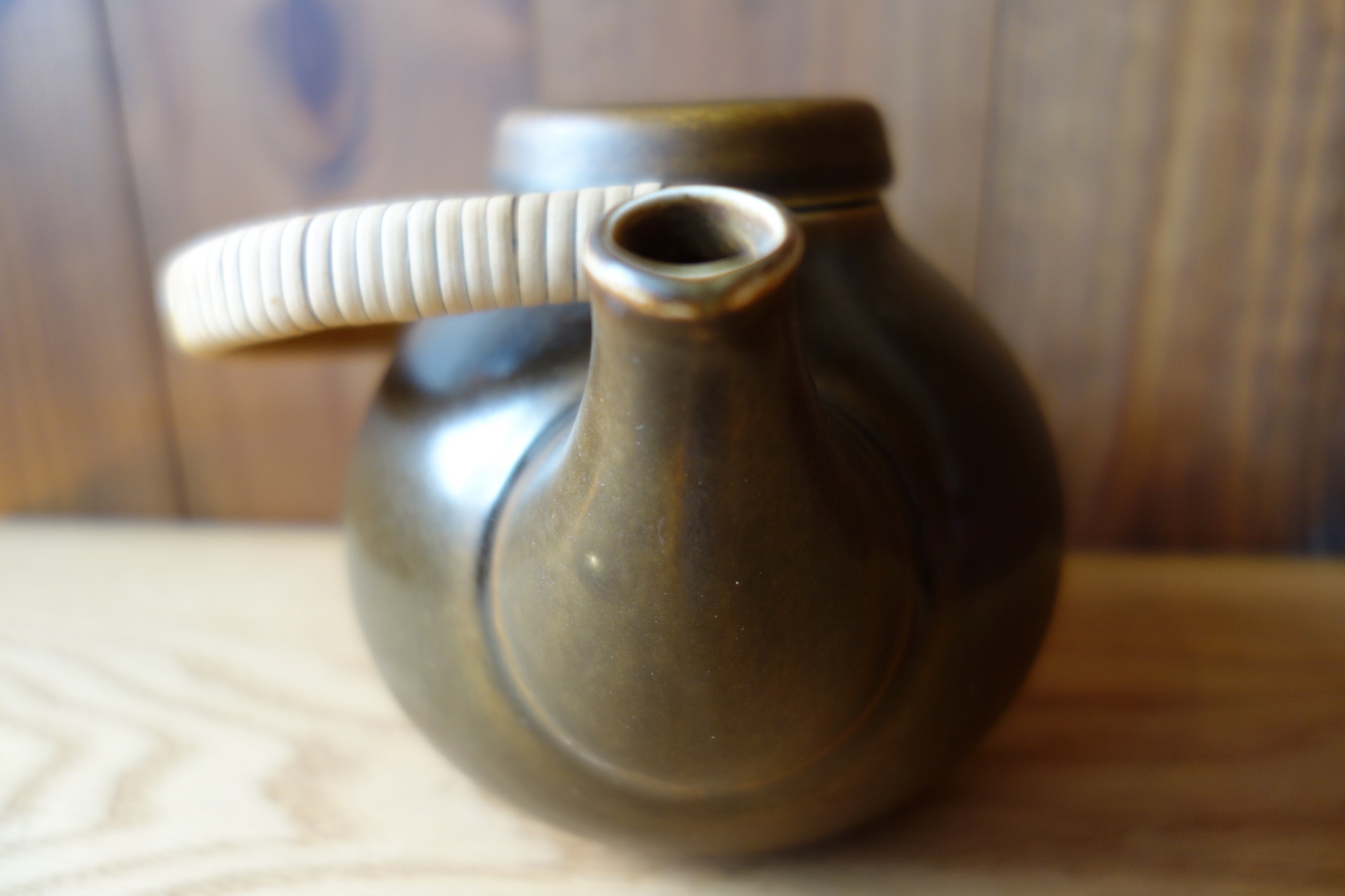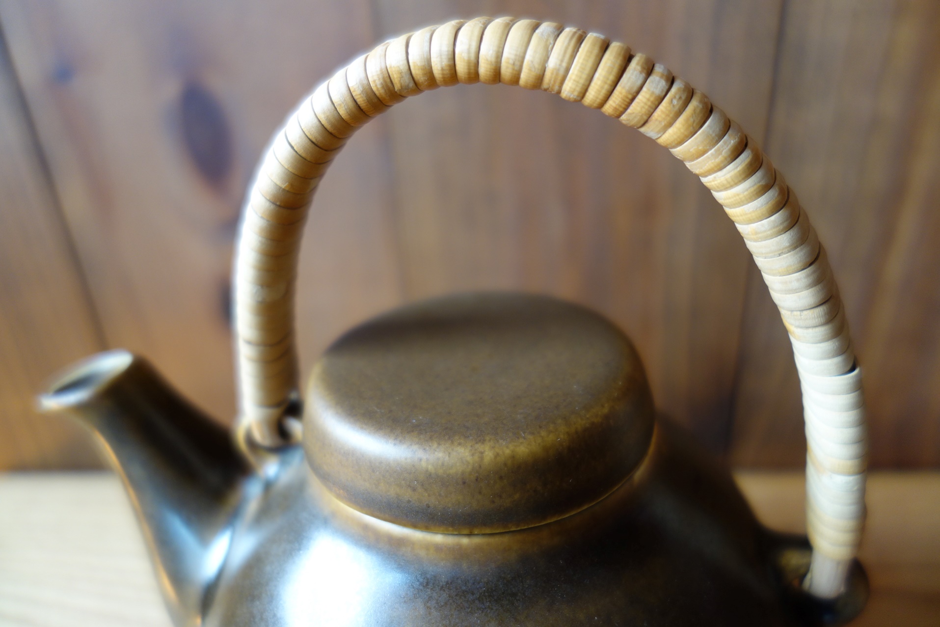 フィンランドの陶器デザイナー Ulla Procope のティポットです。アラビアらしいシックな色合いの急須で、和を感じるデザインになっています。ハンドルの籐も非常に状態が良いです。