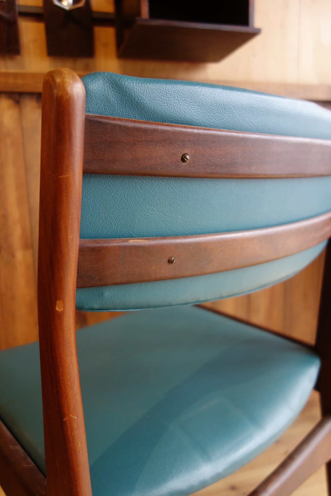「Frem Rojle」は Hans Olsen のダイニングセット「Dinette」を製造したメーカーとして知られており、多数のダイニングチェアを作っています。この椅子は、背もたれが格子のバージョンと、今回の生地張りがあります。