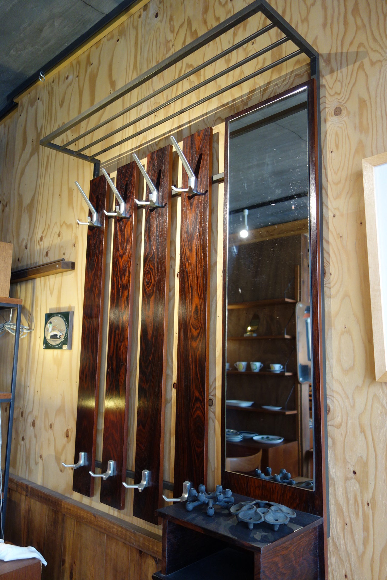 オランダ製のこのコートラック、何といってもフックのデザインが素晴らしく、北欧にはあまりないとがったデザインとなっています。トップには鞄や帽子が置ける棚、右側には良いサイズの鏡、その下には、ちょっとした物が収納できる棚が付いています。