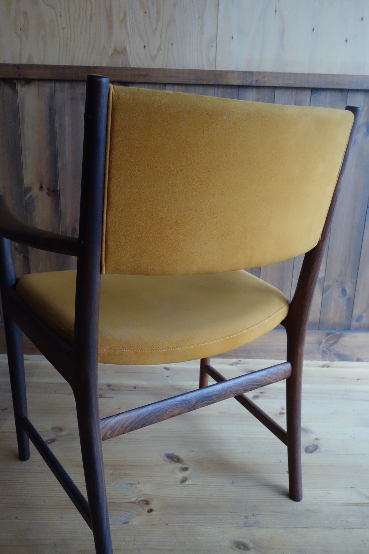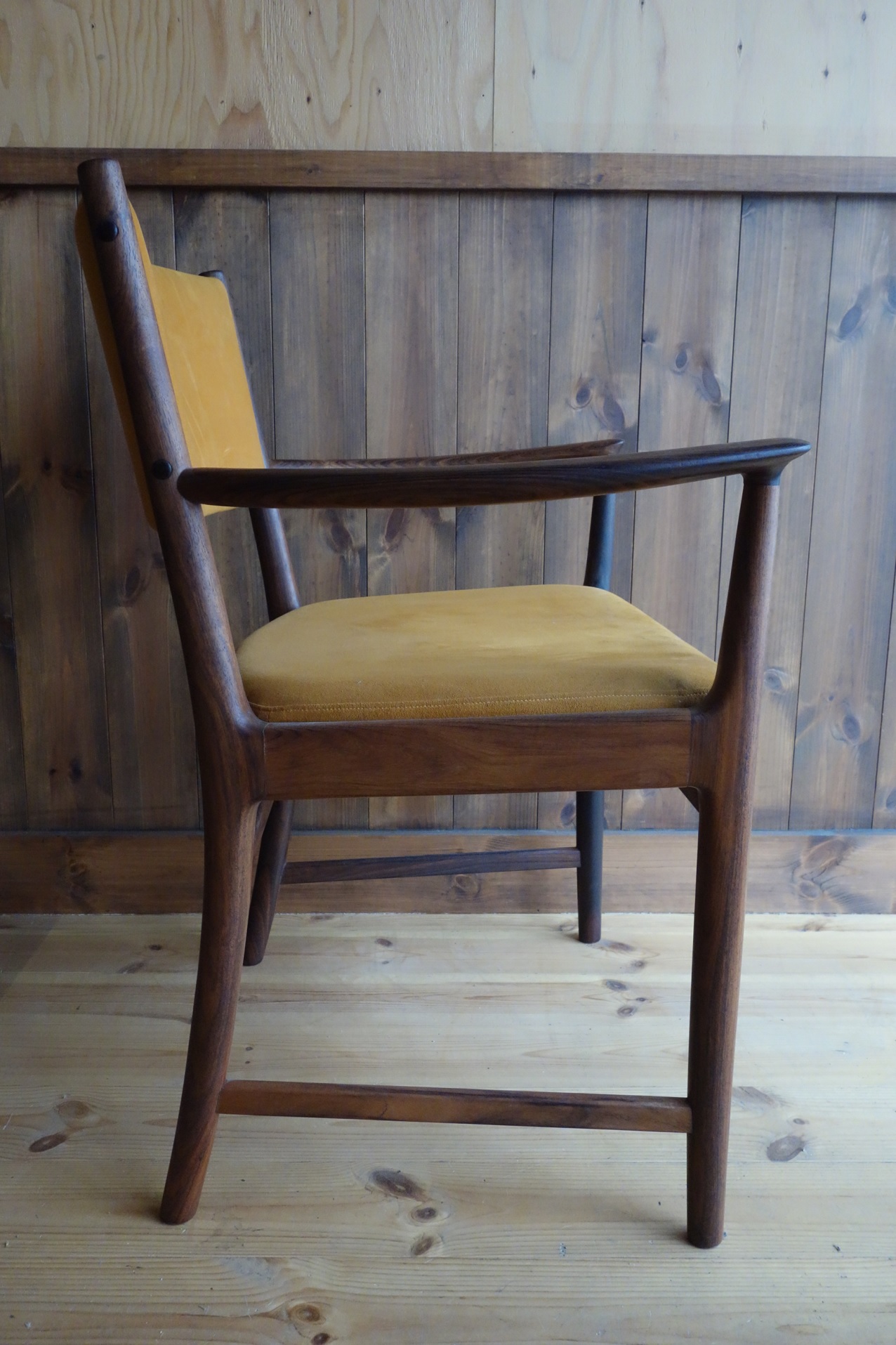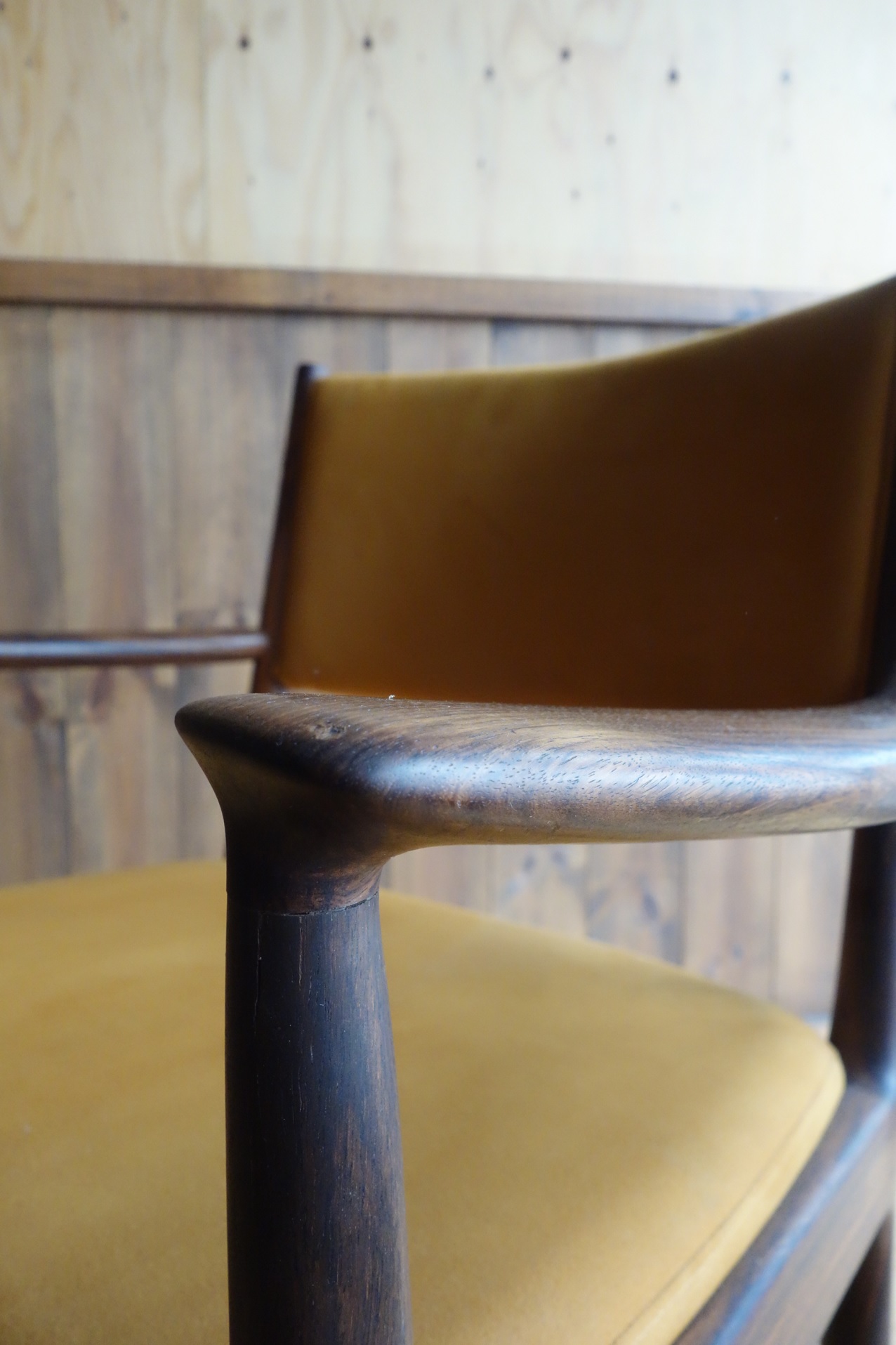 Grete Jalk や Johannes Andersen を思わせるようなフォルムなのですが、デザイナーや年代、メーカーも不明な椅子です。
