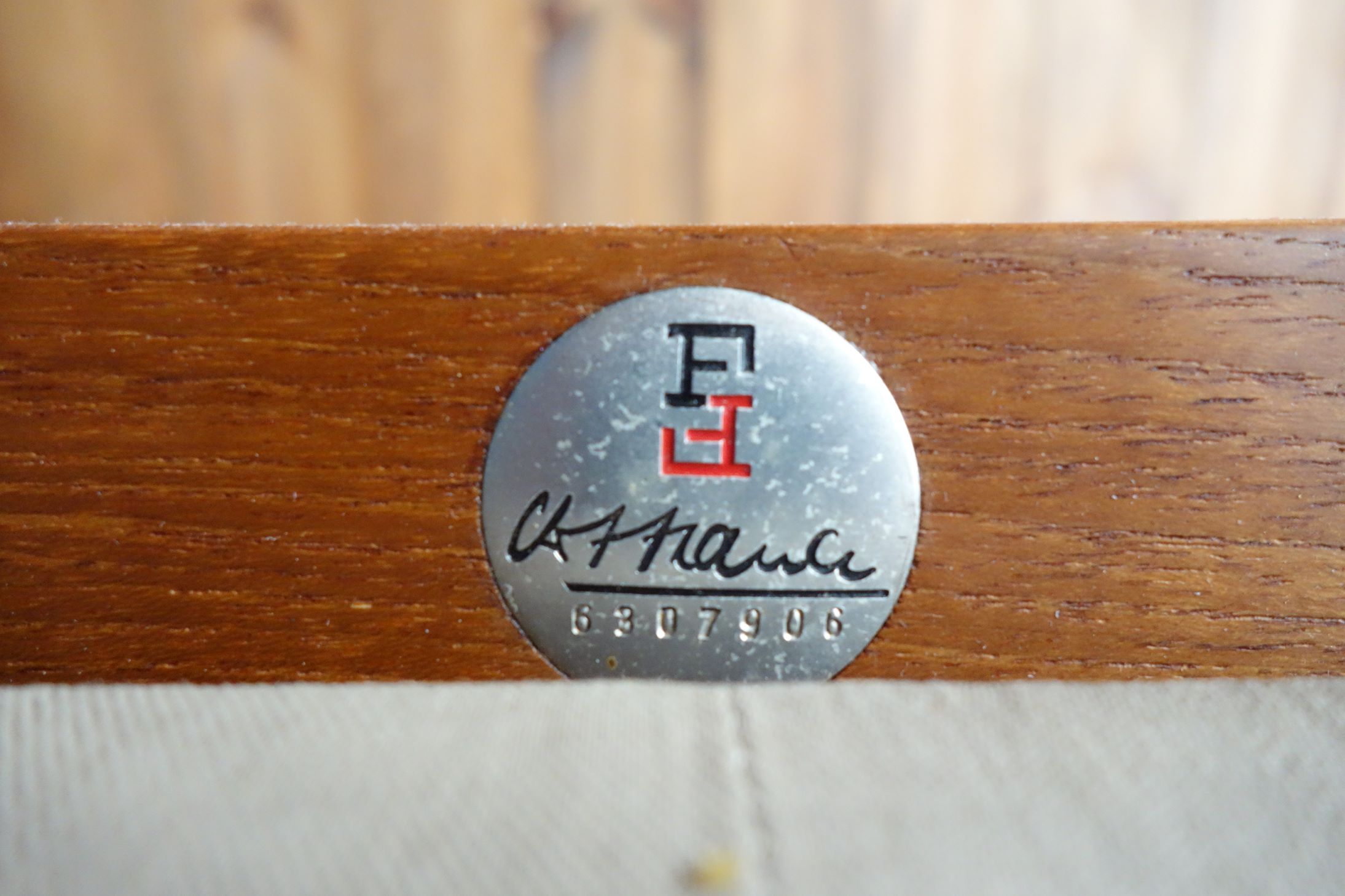 写真のソファは、フレームは仕上げ済みですが、クッションは当時のままですので、お好みの張地をお選びいただけます。内部はオリジナルのコイルスプリングですが、当店では張替え時に、一旦、解体し、スプリングの調整とローテーションの組み換えを行います。