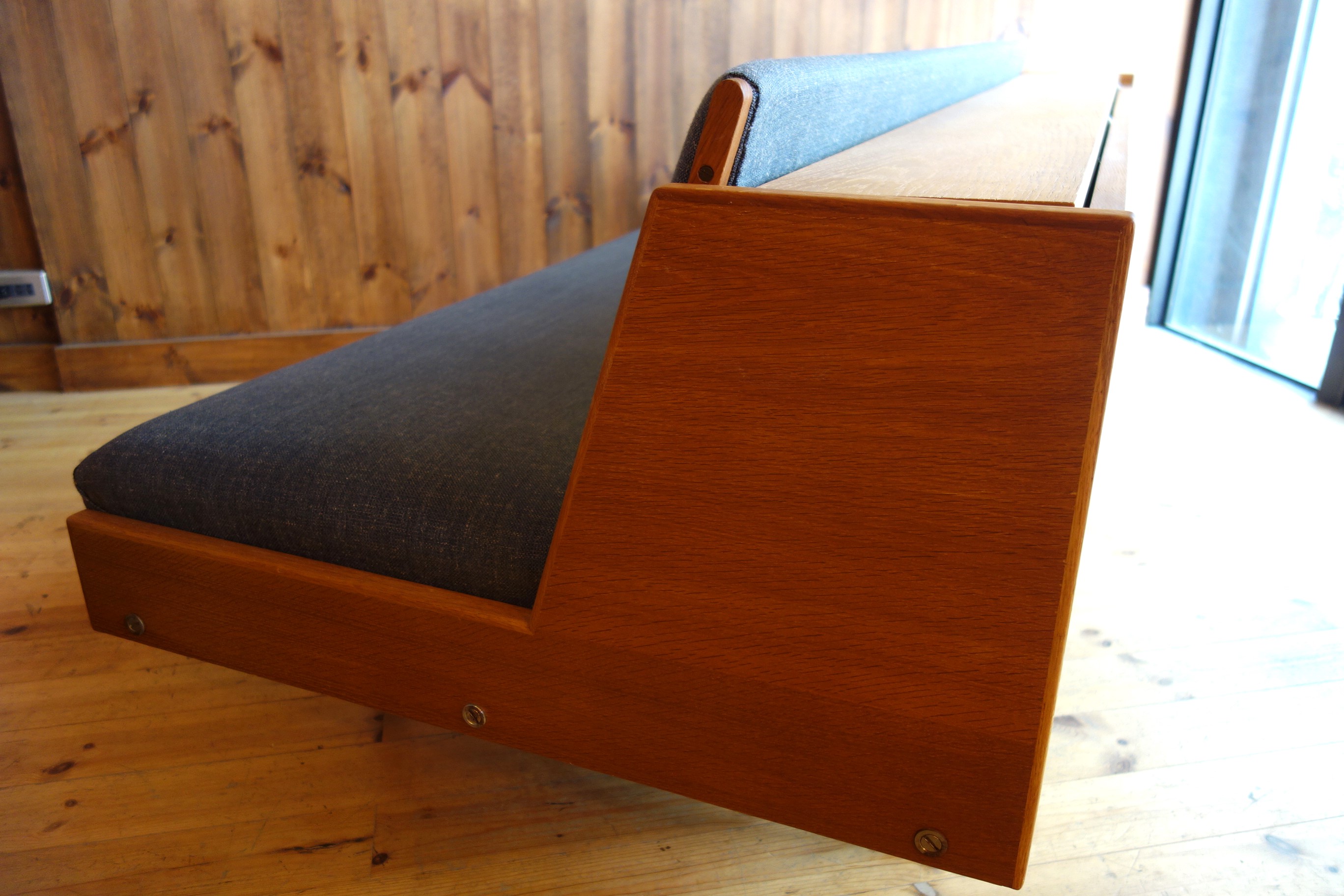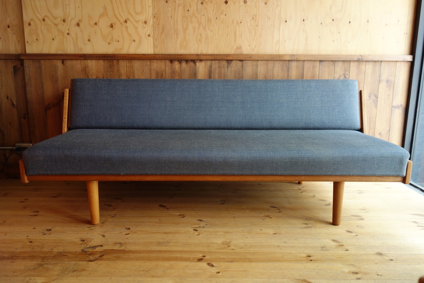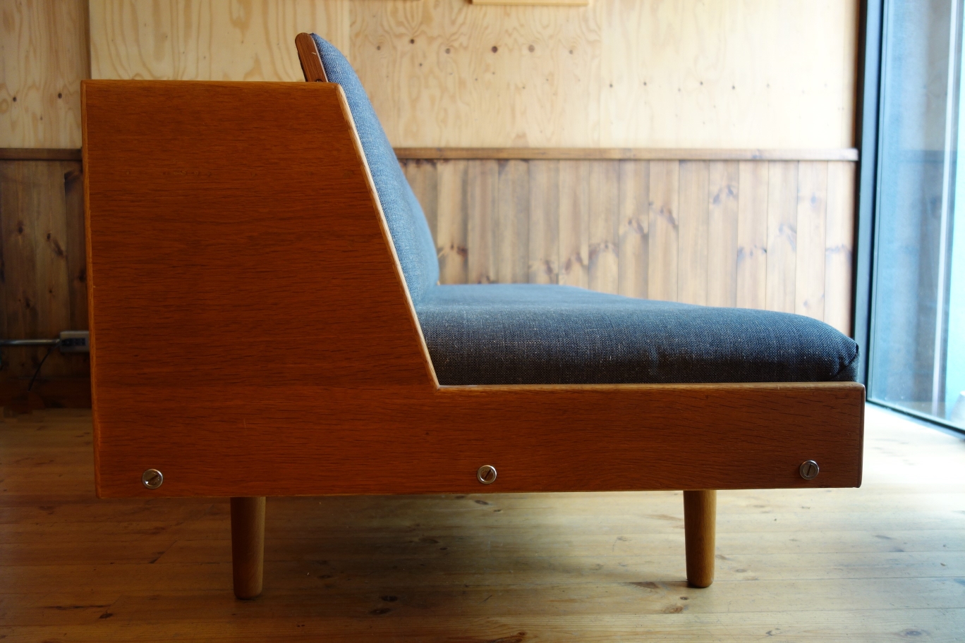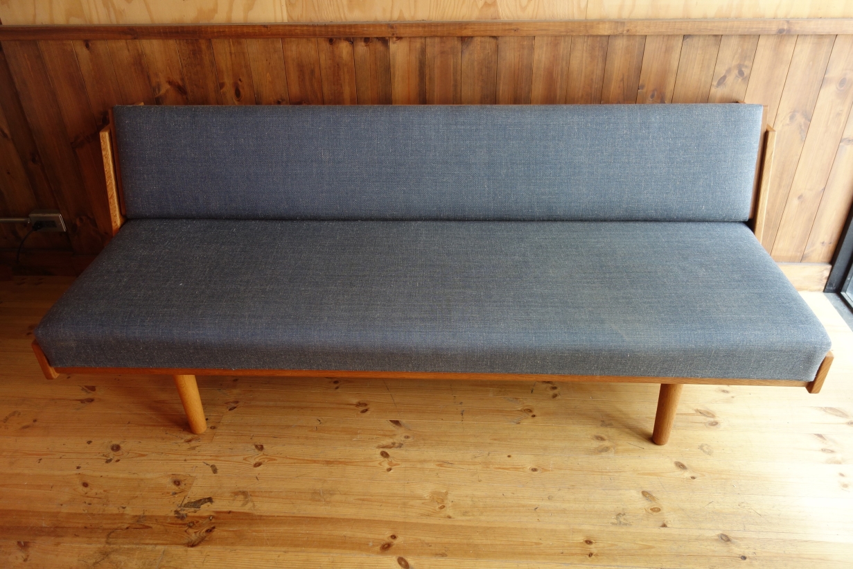 Wegnerの家具、特にソファに見られる品番の頭のアルファベットはメーカーを表しているのですが、「GE」は「GETAMA」社を表しています。GETAMAは元々、ソファやベッドのクッション、マットレスを製造する会社で、張りぐるみのソファ形成も得意とする会社です。70年代の繁忙期には、Wegnerの他社製品も請け負っていたとか・・・この簡易式ソファベッドは、元々、公共の施設用の物で、特にデンマーク軍の施設で多用されていたようです。様々なサイズやオプション(袖ありやダブルベッドなど)があるのも特徴です。