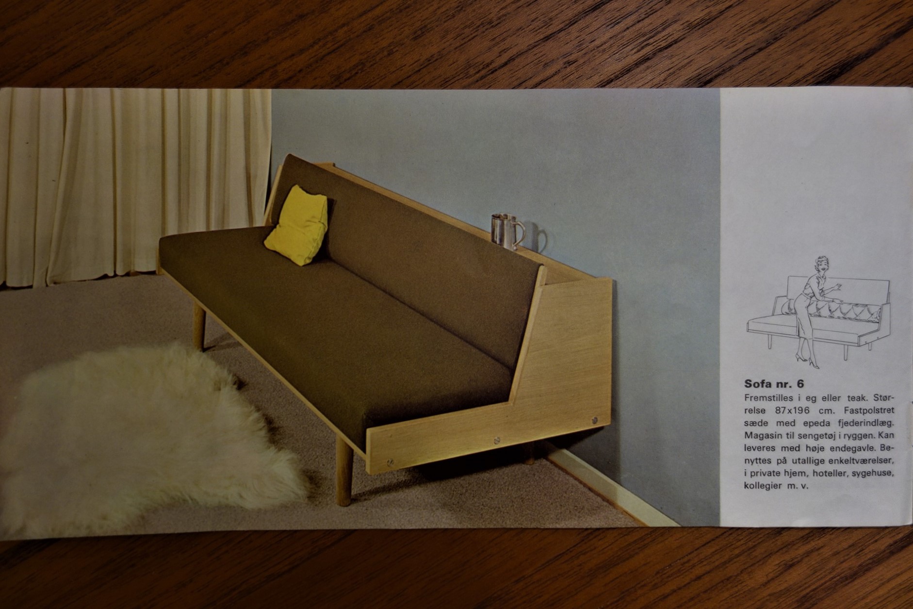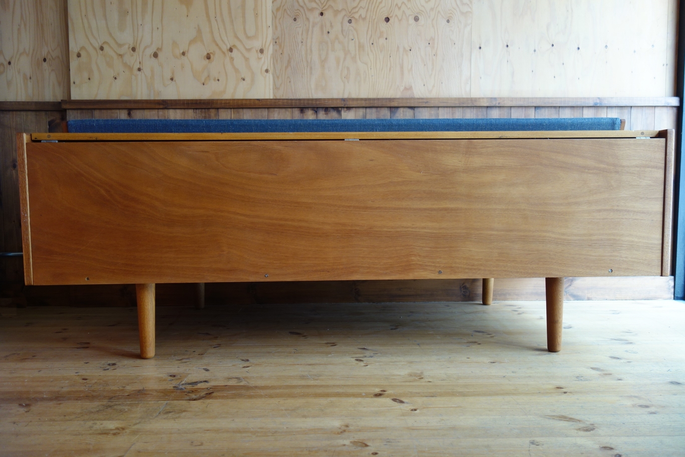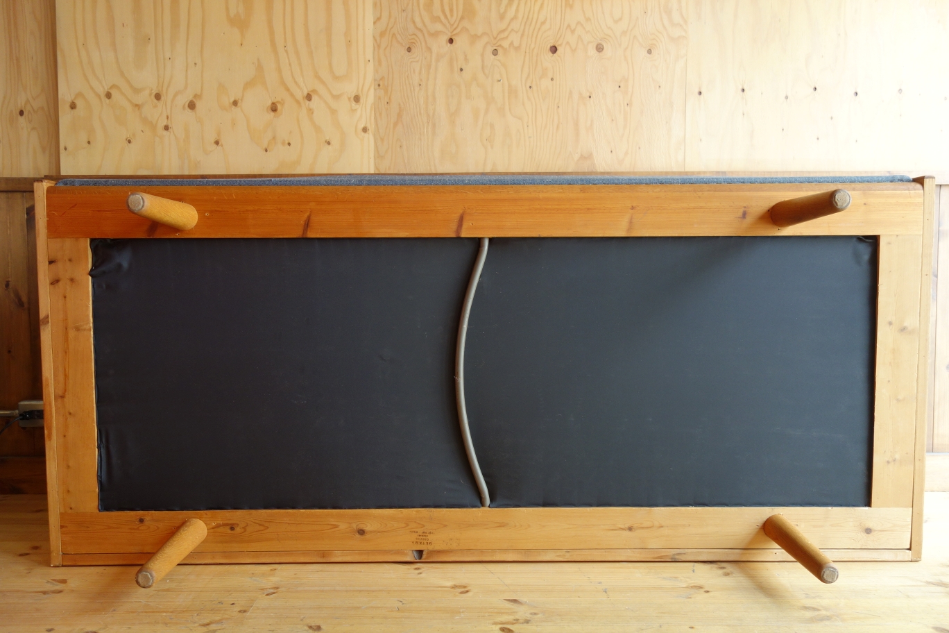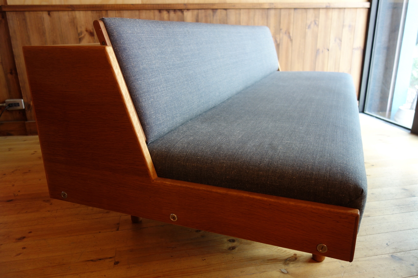 Wegnerの家具、特にソファに見られる品番の頭のアルファベットはメーカーを表しているのですが、「GE」は「GETAMA」社を表しています。GETAMAは元々、ソファやベッドのクッション、マットレスを製造する会社で、張りぐるみのソファ形成も得意とする会社です。70年代の繁忙期には、Wegnerの他社製品も請け負っていたとか・・・この簡易式ソファベッドは、元々、公共の施設用の物で、特にデンマーク軍の施設で多用されていたようです。様々なサイズやオプション(袖ありやダブルベッドなど)があるのも特徴です。